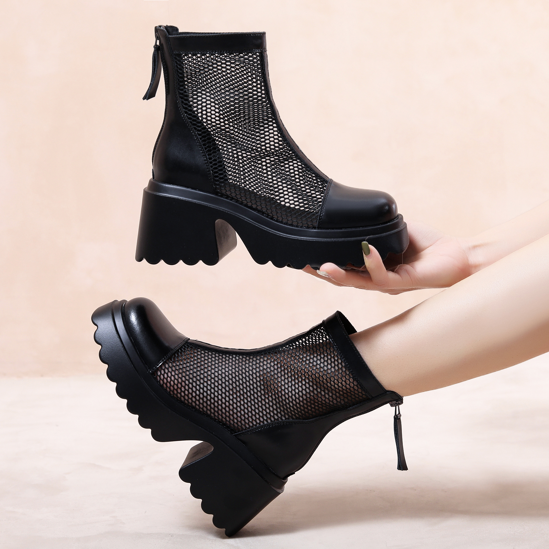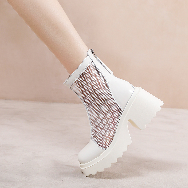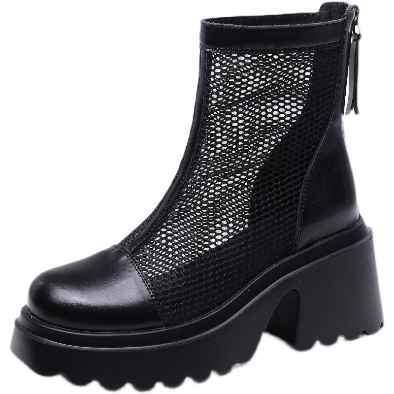 马丁靴网面厚底镂空真皮短靴