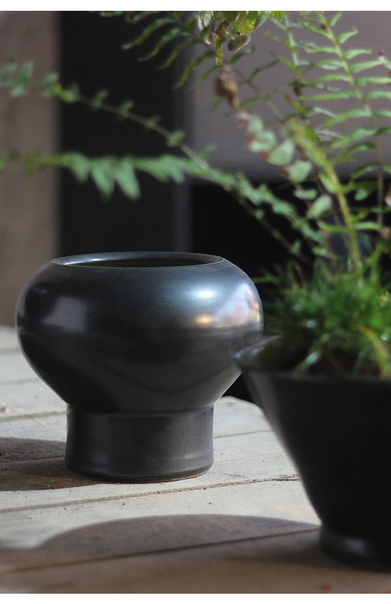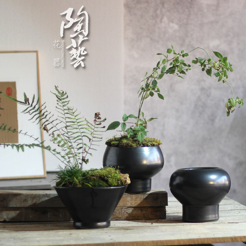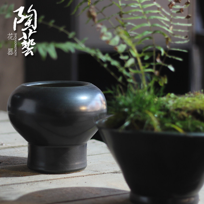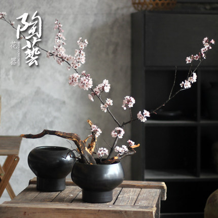 黑色花瓶摆件多肉花盆花器新中式客厅插花干花仿真花复古土小陶罐