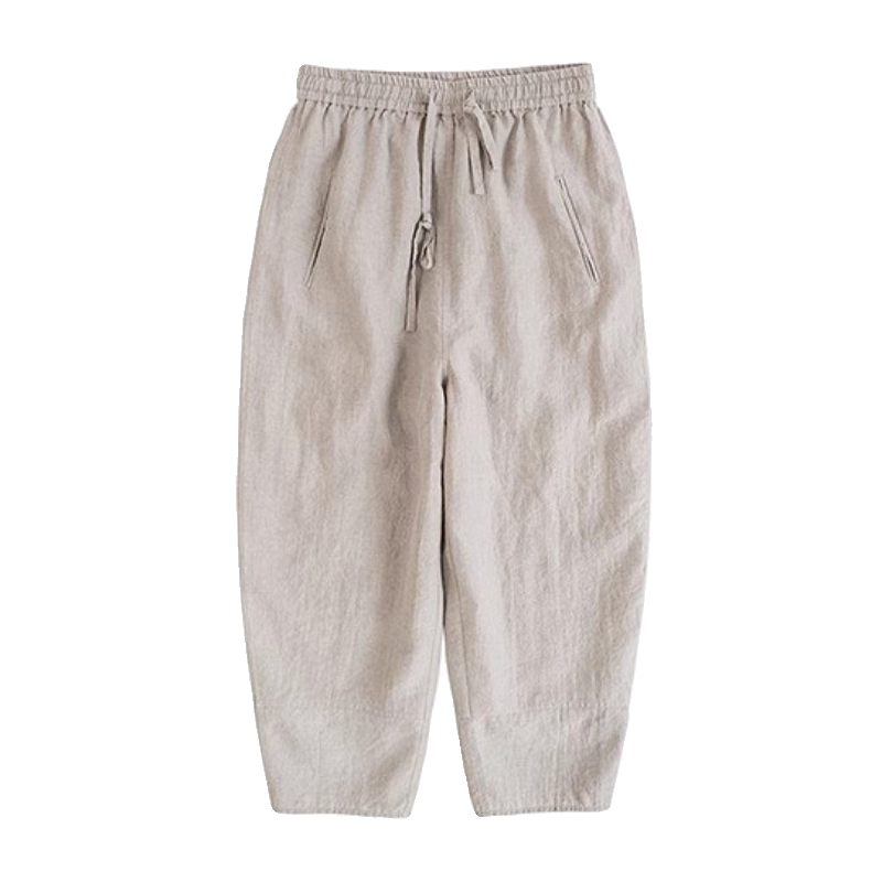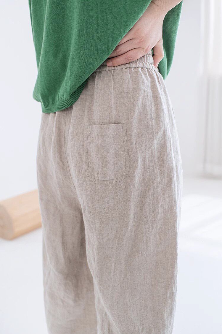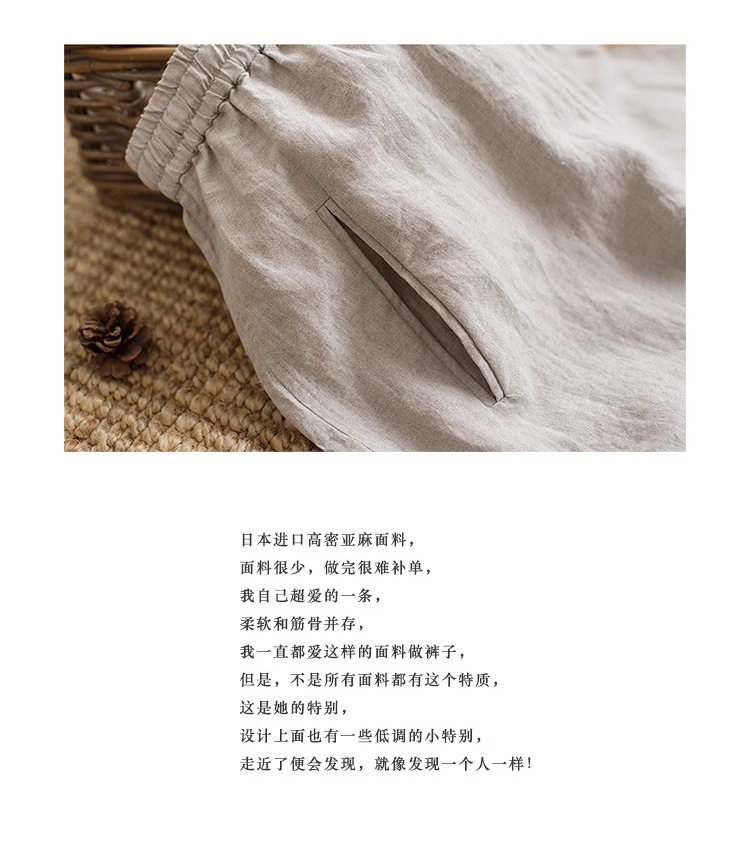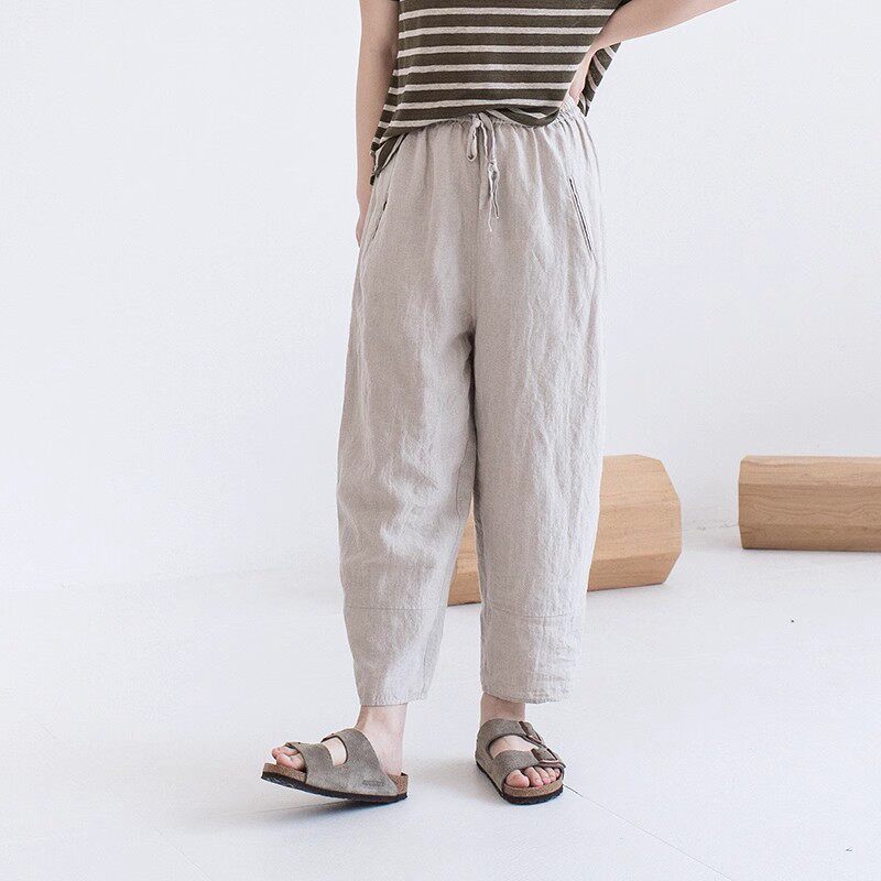 2024夏季新款亚麻面料简约百搭松紧腰宽松雨露麻9分麻裤