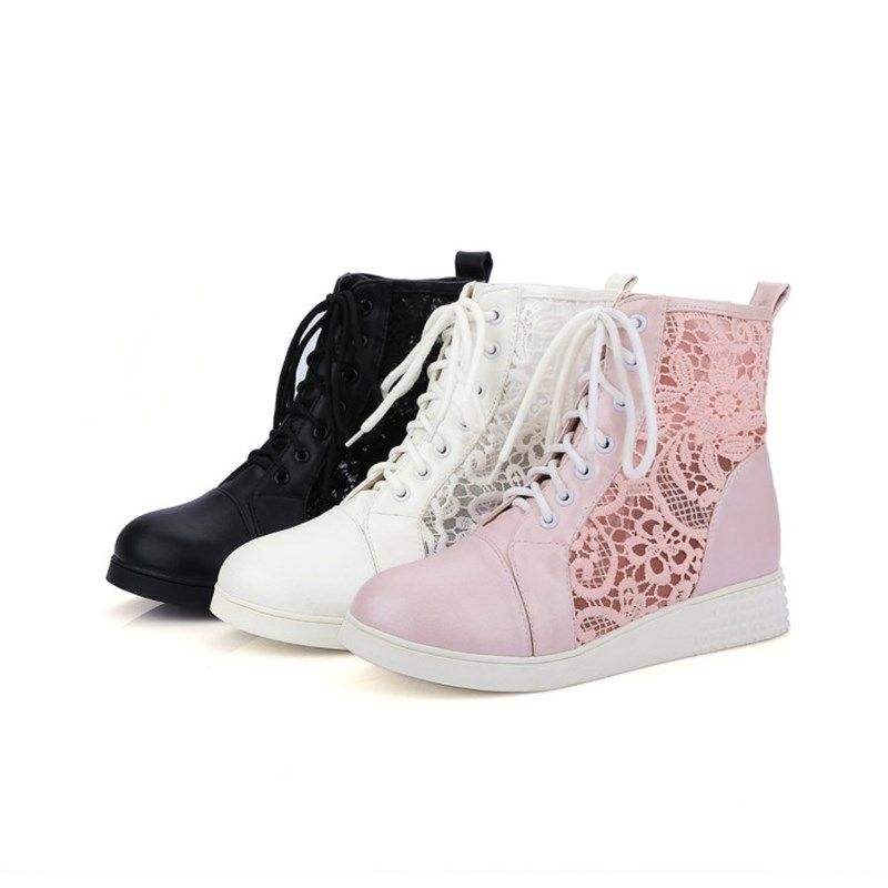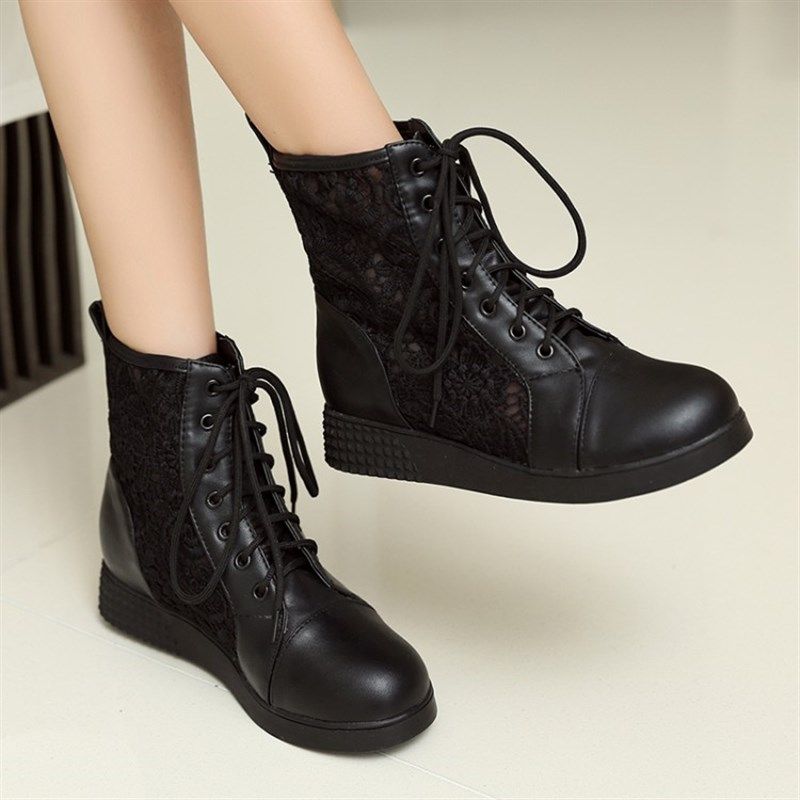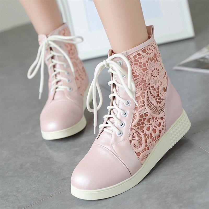 韩版单靴子女鞋春秋夏季镂空网靴蕾丝系带短靴40平底41大码43白色