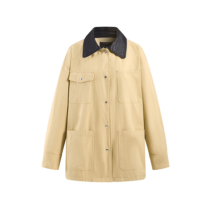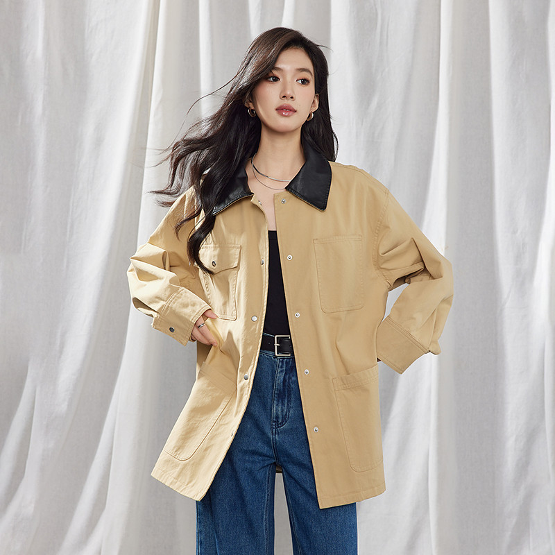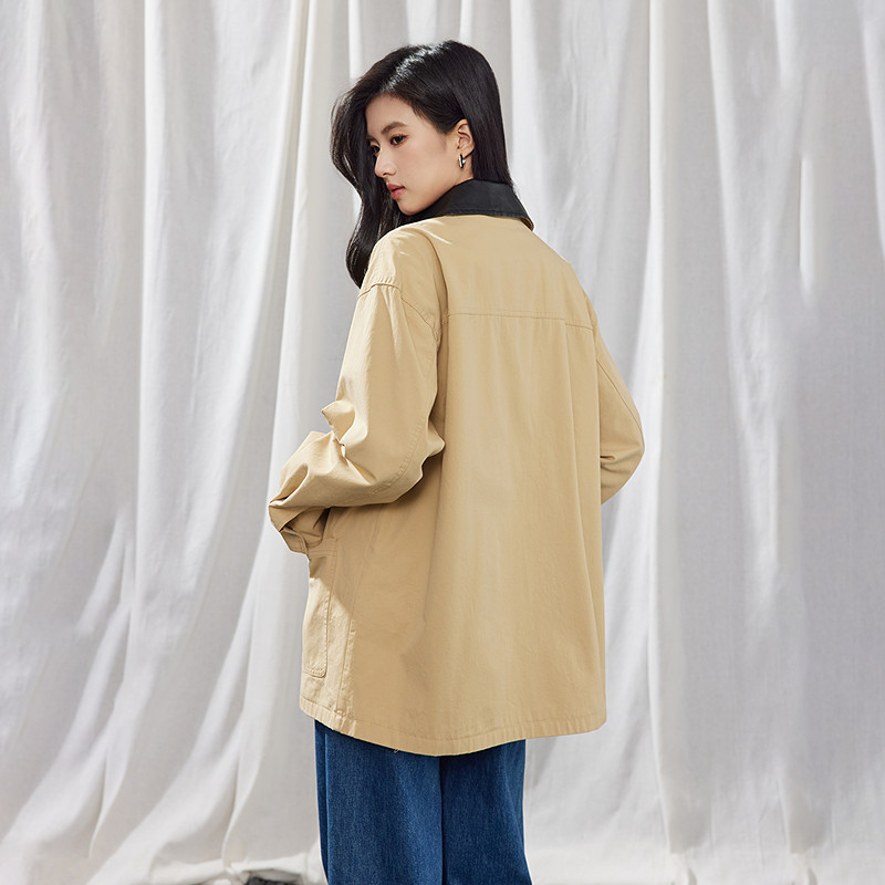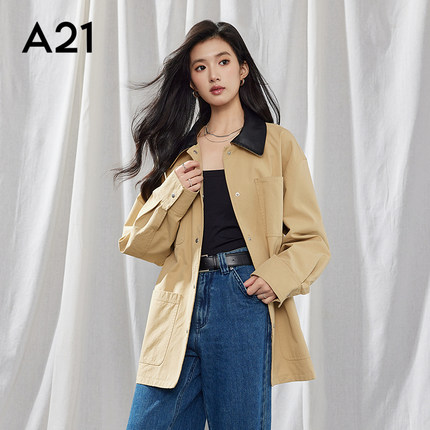 A21女装春季撞色拼接PU皮翻领工装短外套巴恩风夹克上衣