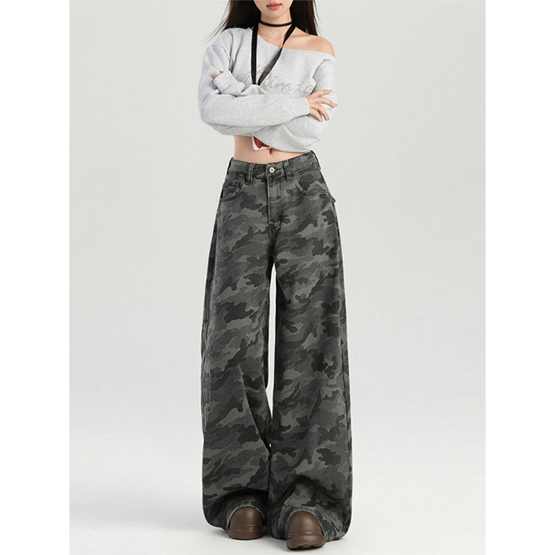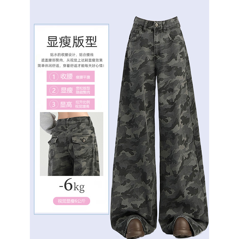 大码女装美式复古迷彩工装牛仔裤女夏季胖mm慵懒松弛感显瘦阔腿裤