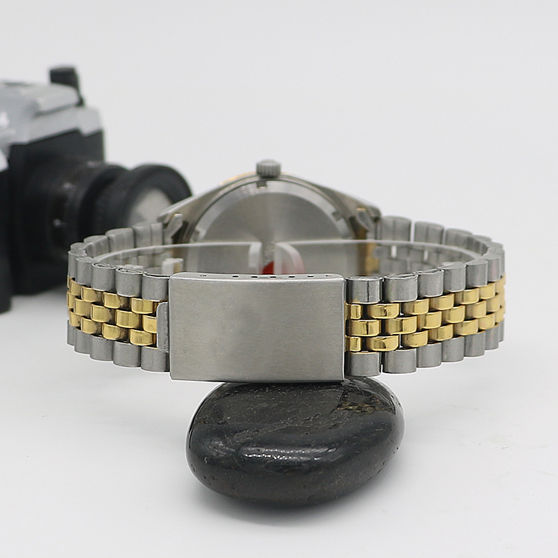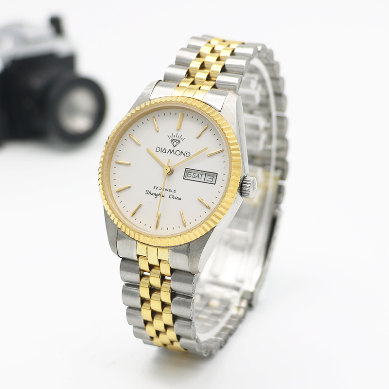 老钻石手表日历间金白盘发条手动机械表中老年男表古董表库存全新