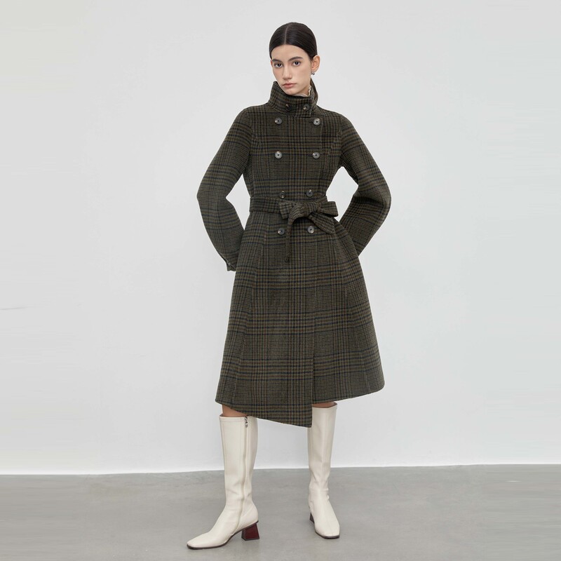 sdeer圣迪奥女装老钱风立领格纹收腰毛呢长款羊毛大衣S23462504