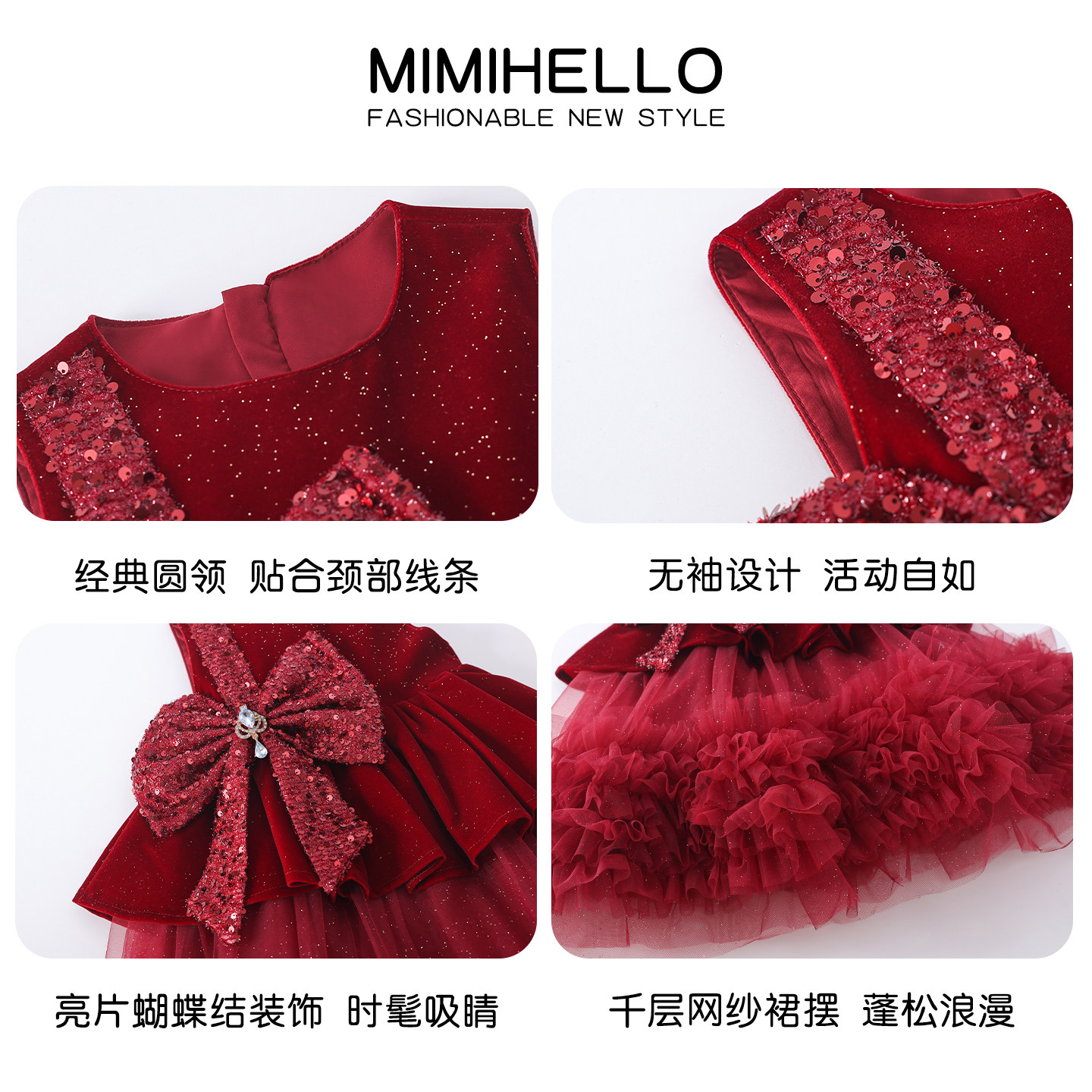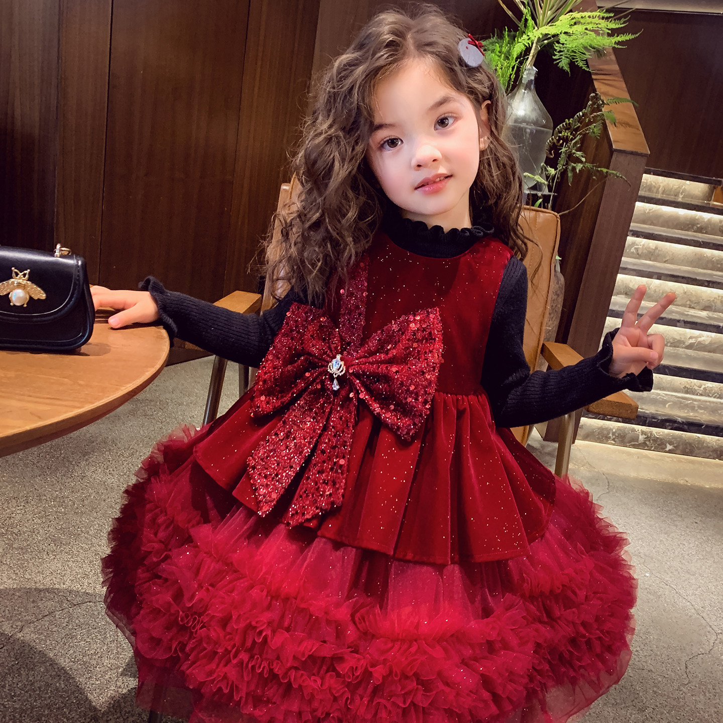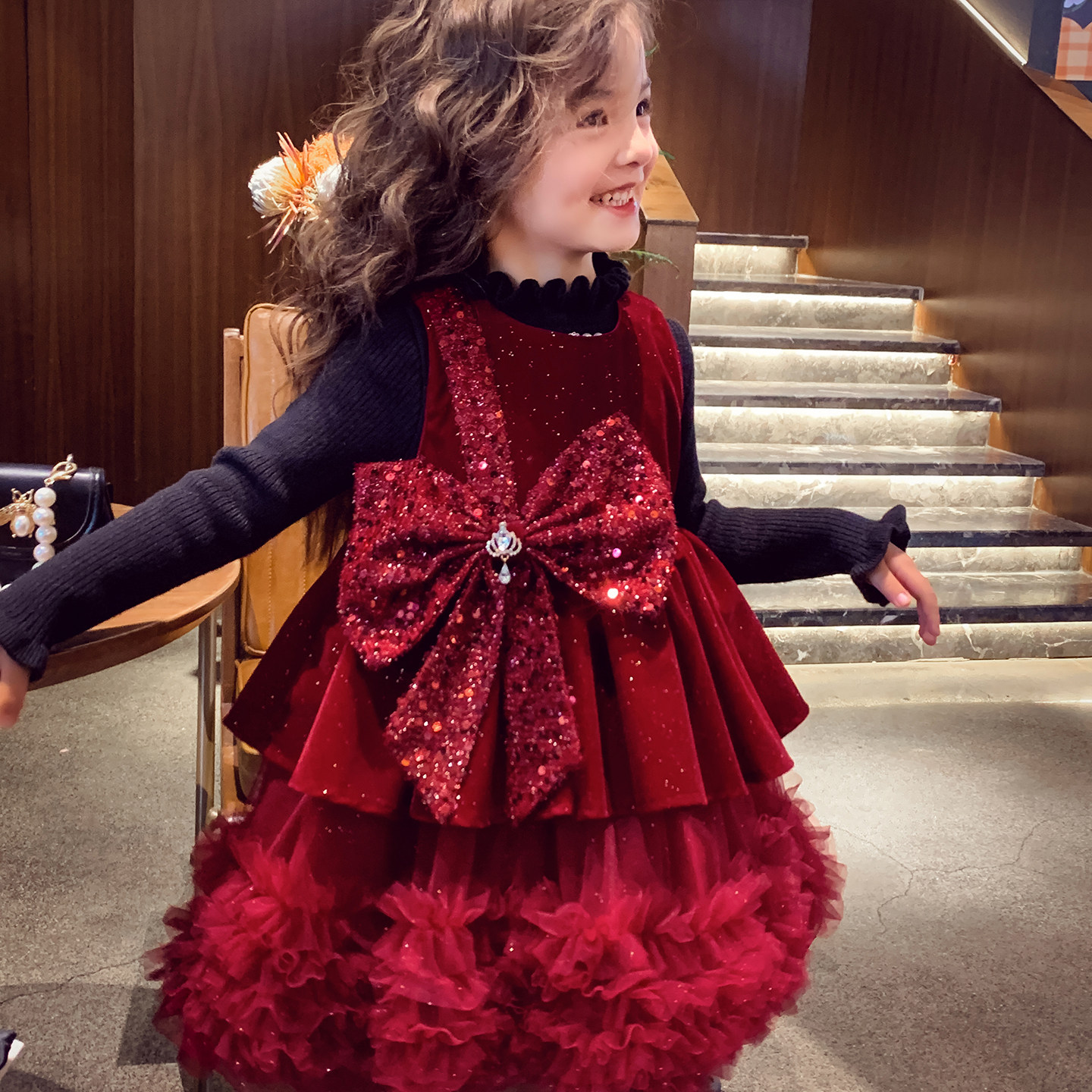女童连衣裙秋冬2025新款儿童洋气蝴蝶结蓬蓬背心公主裙女孩礼服裙