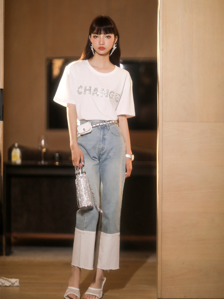 CAN浅色牛仔裤女夏宽松2022新款设计感拼接直筒显瘦薄款九分裤女
