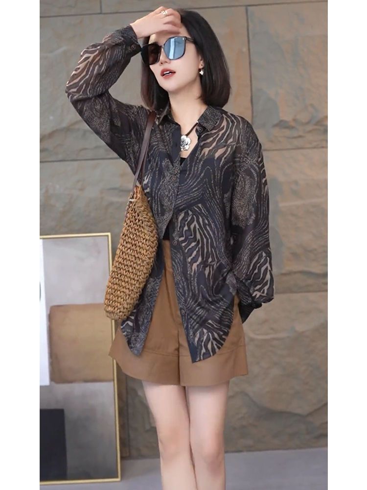 2025春夏新款防晒衬衣印花上衣显瘦长袖衬衫女休闲百搭复古雪纺衫