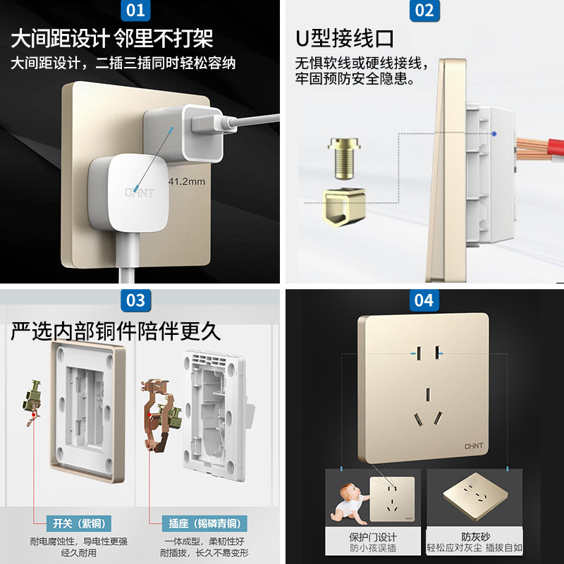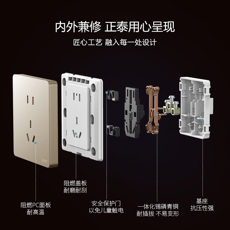 正泰开关插座面板86型墙壁暗装三孔金色家用5孔带usb一开双控五孔