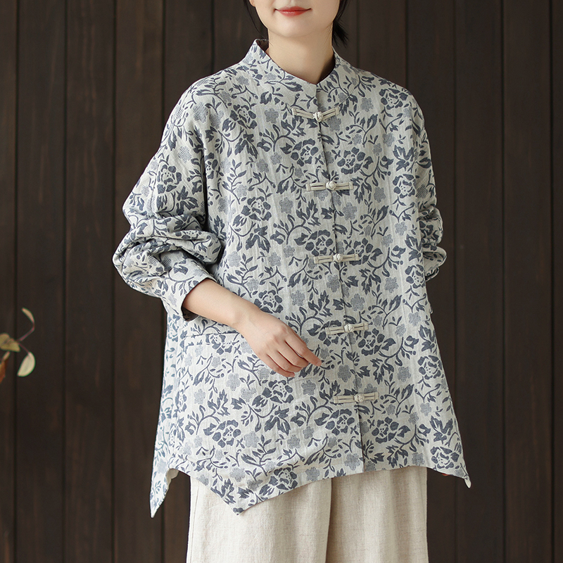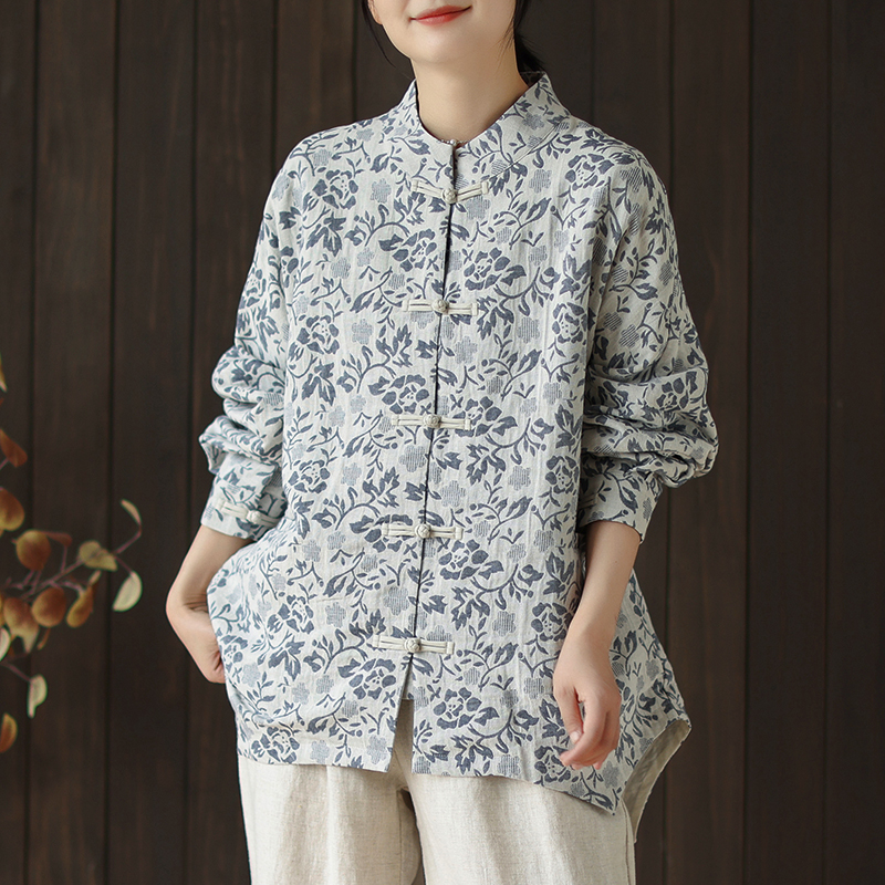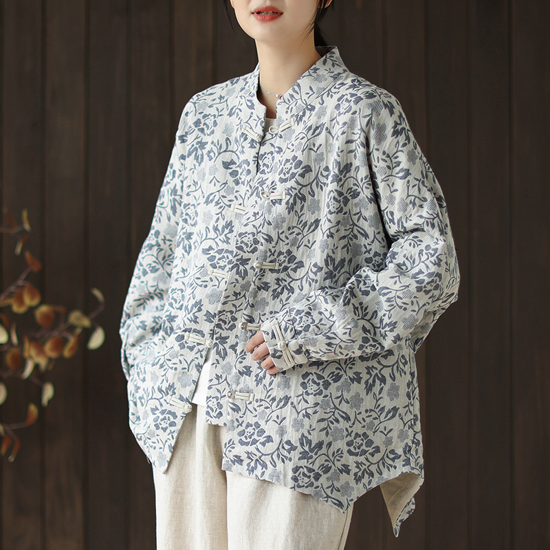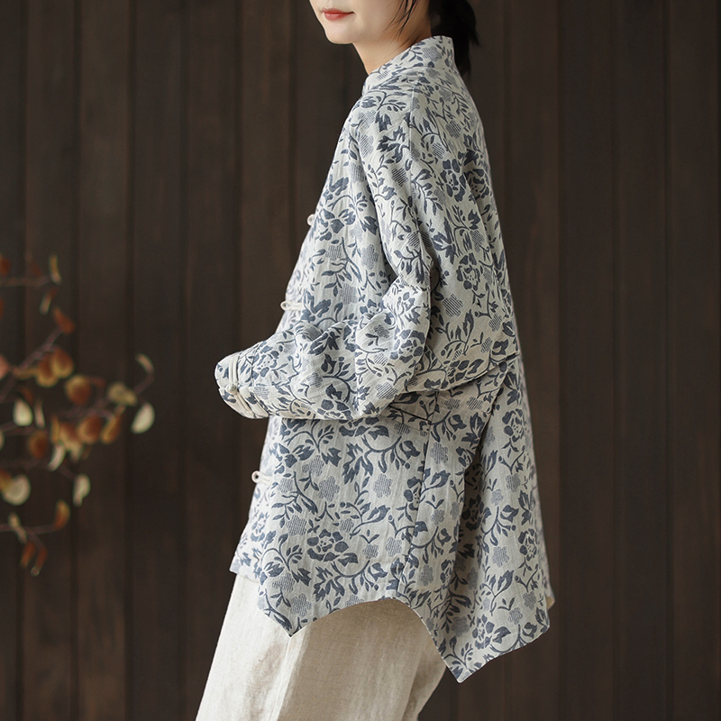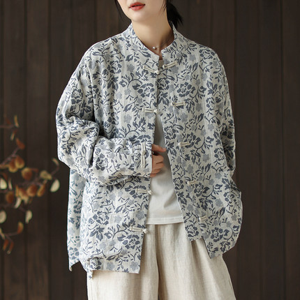 新中式国风复古印花棉麻外套女秋冬款高级感对襟盘扣立领开衫上衣