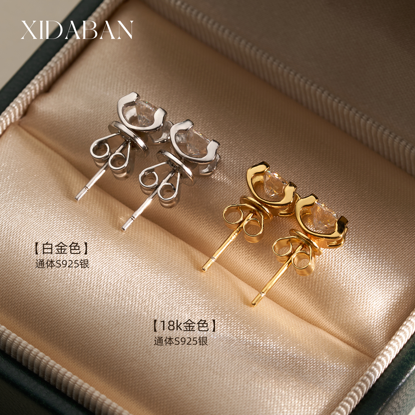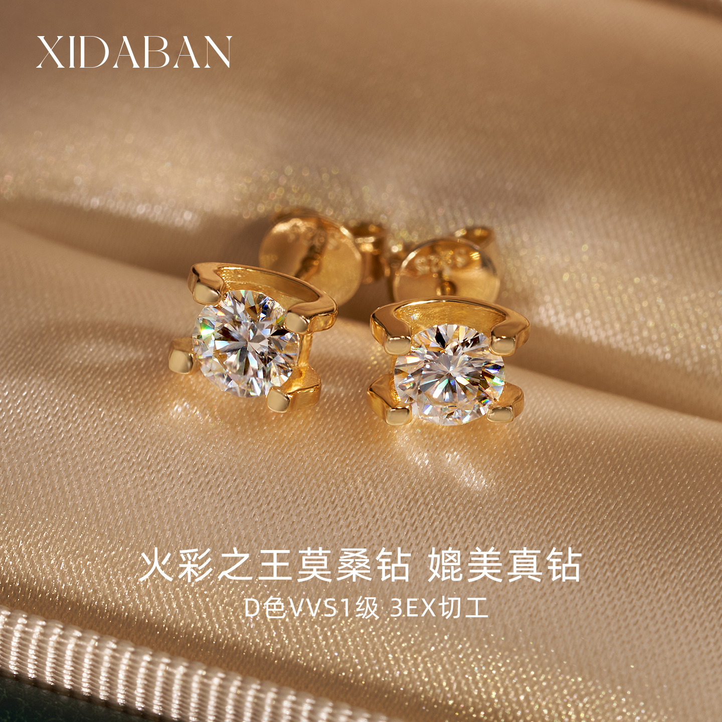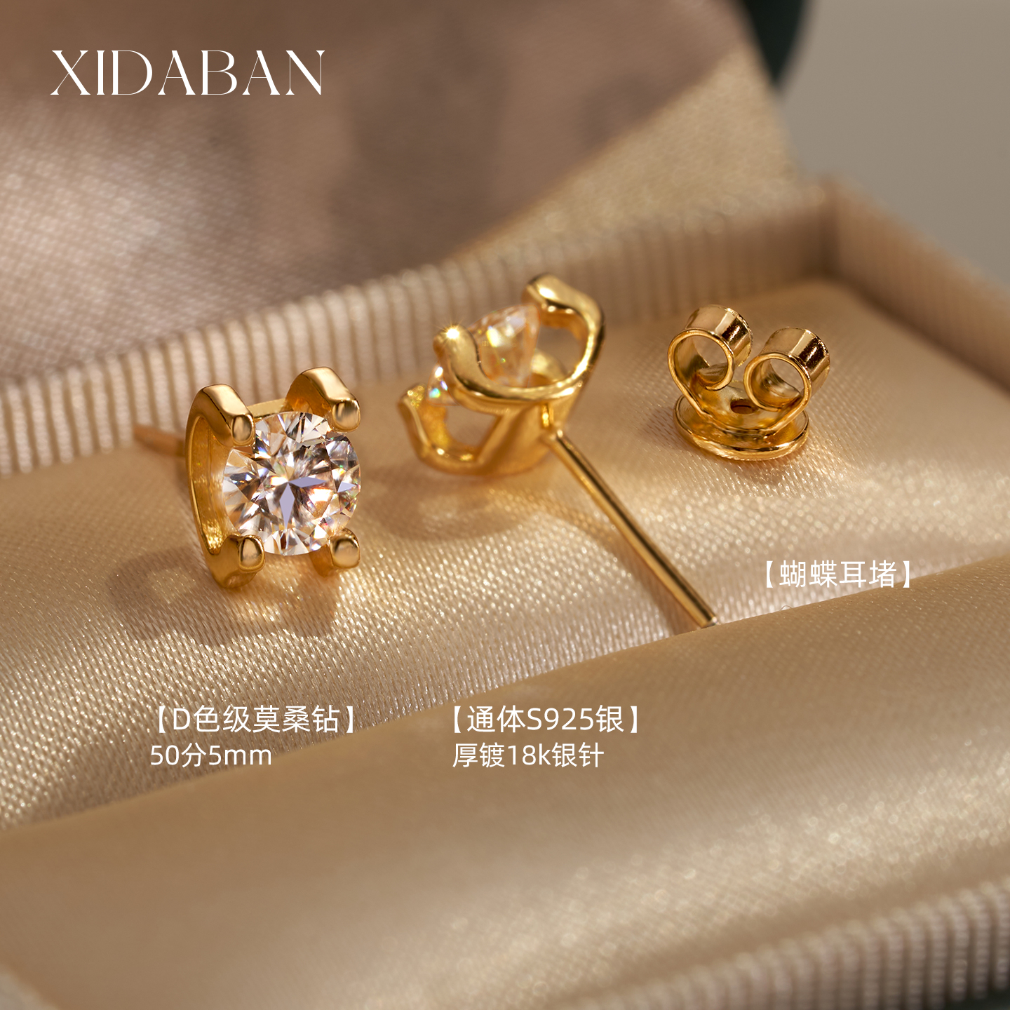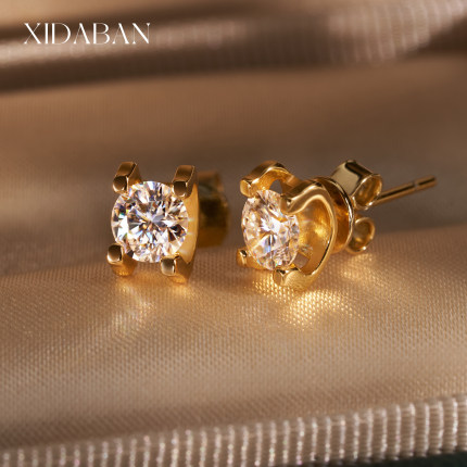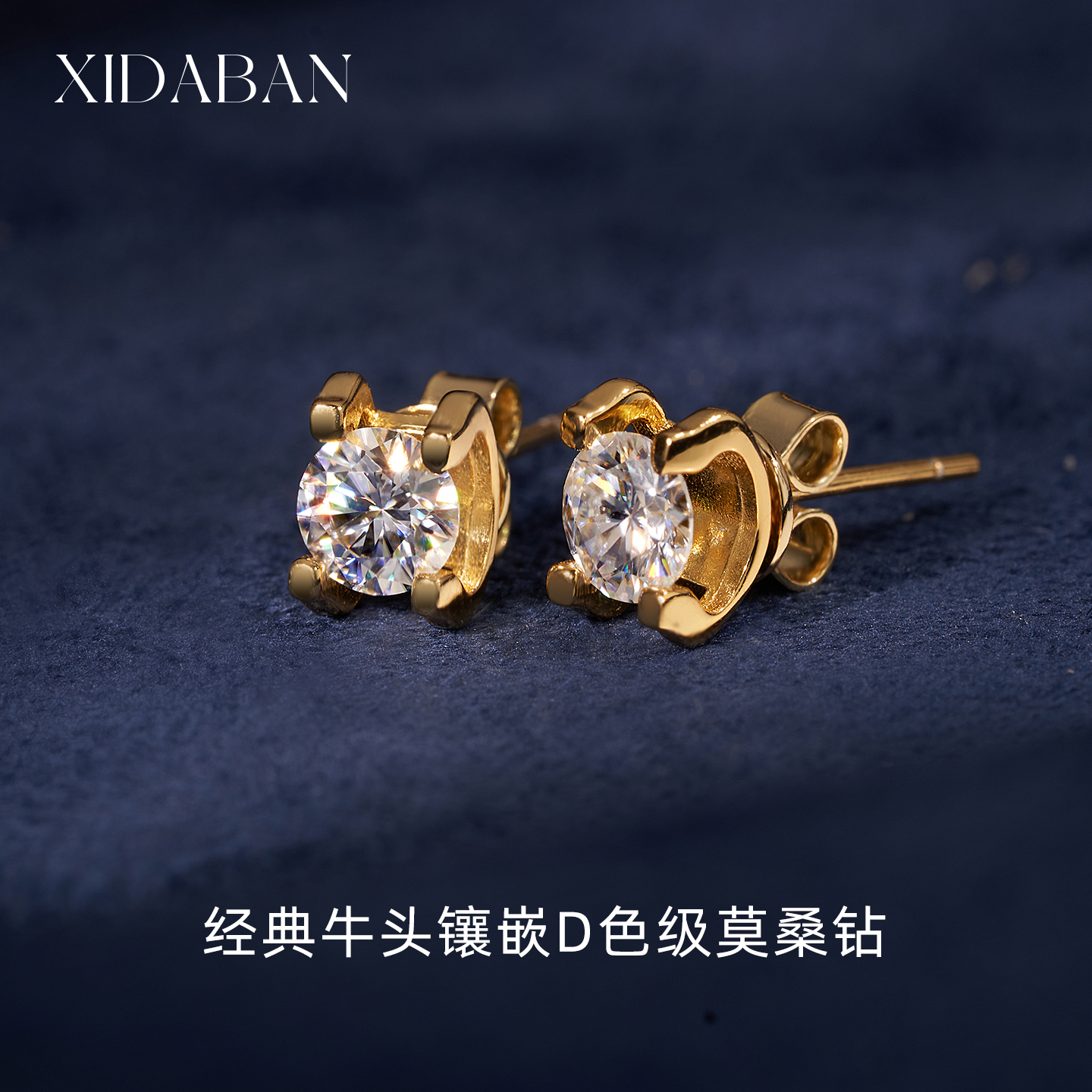 西大班正品D色莫桑钻石耳钉牛头单钻耳环纯银镀18k金高级感耳骨钉