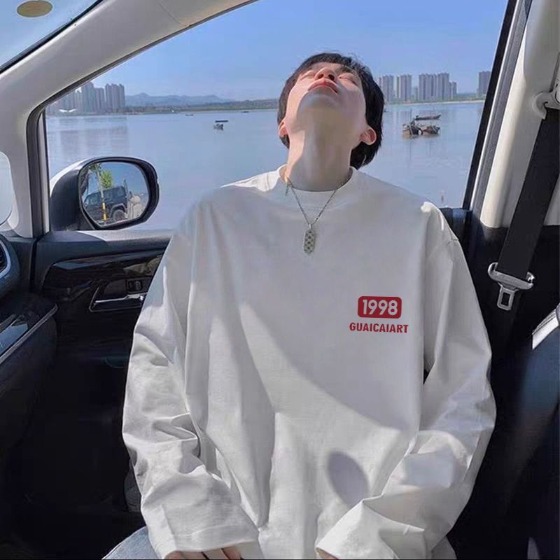 ins风小众长袖t恤痞帅男生白色显瘦秋季宽松中长款休闲风纯棉上衣