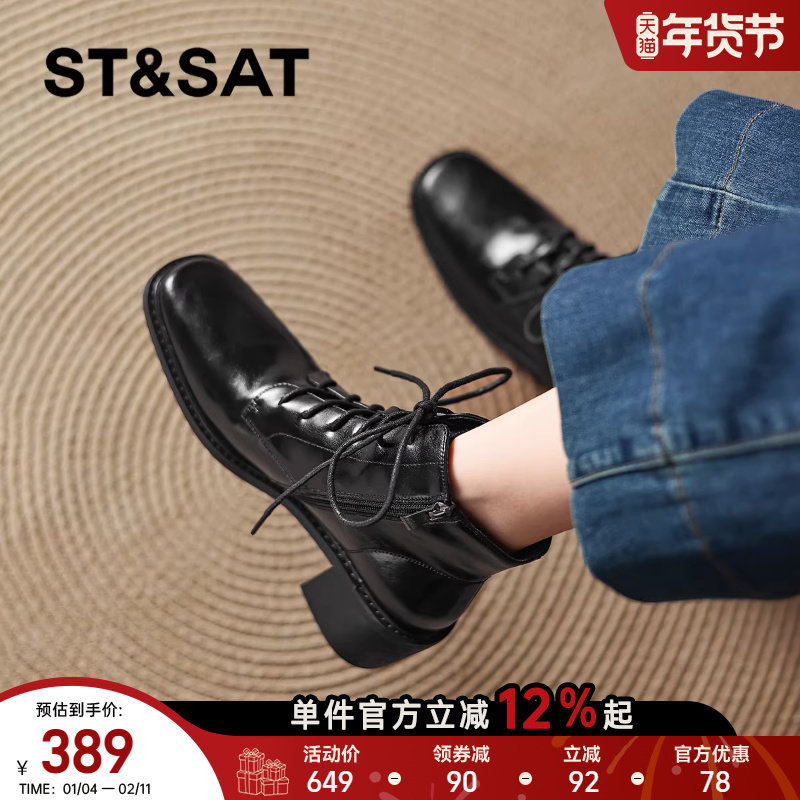 星期六系带高跟短靴女2025新款秋冬粗跟靴子黑色马丁靴切尔西女靴