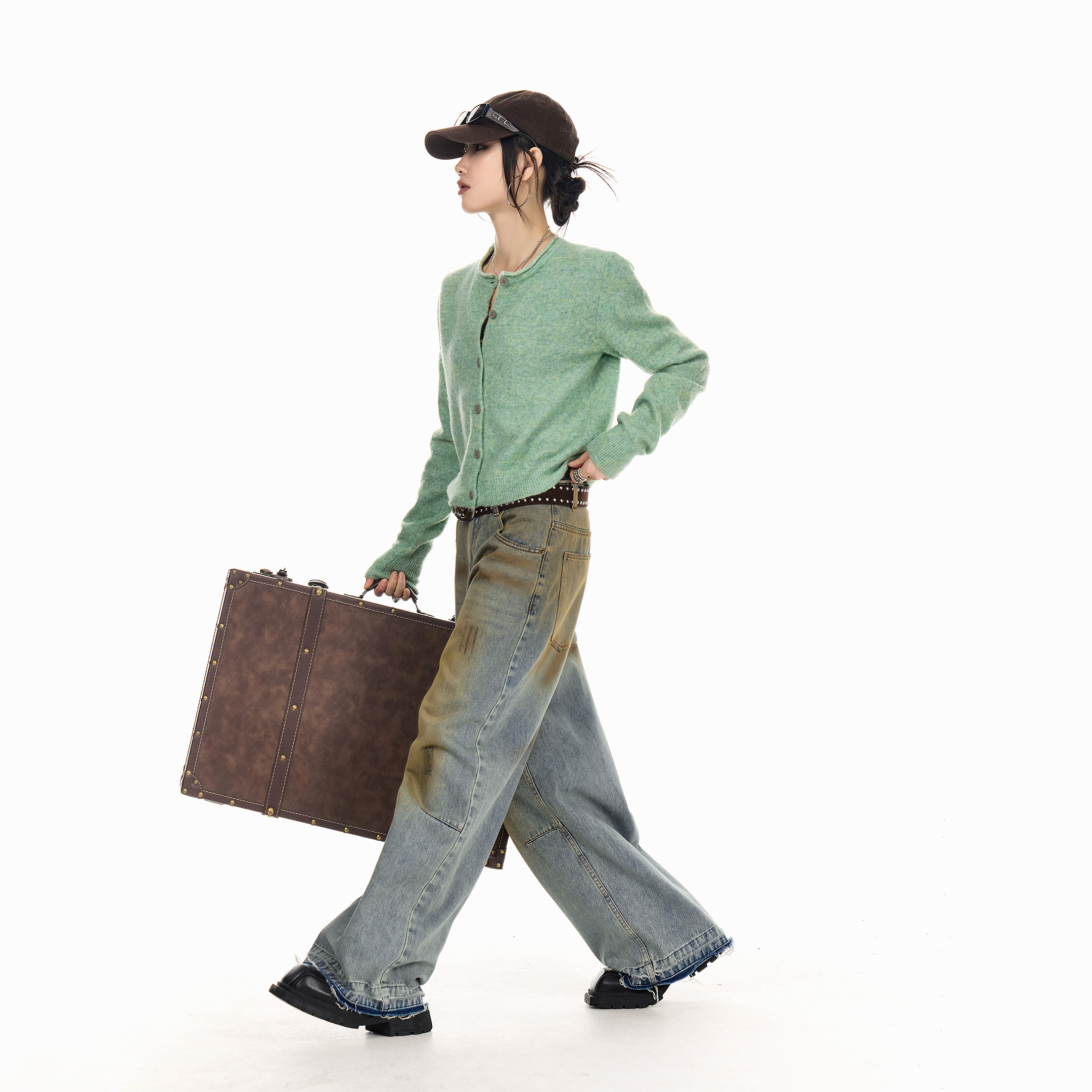ICH MODE 美式复古薄荷绿短款针织开衫女秋冬季修身慵懒毛衣外套