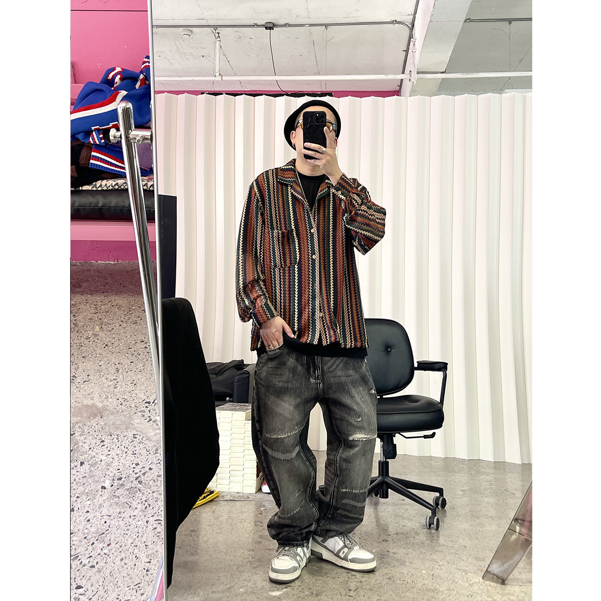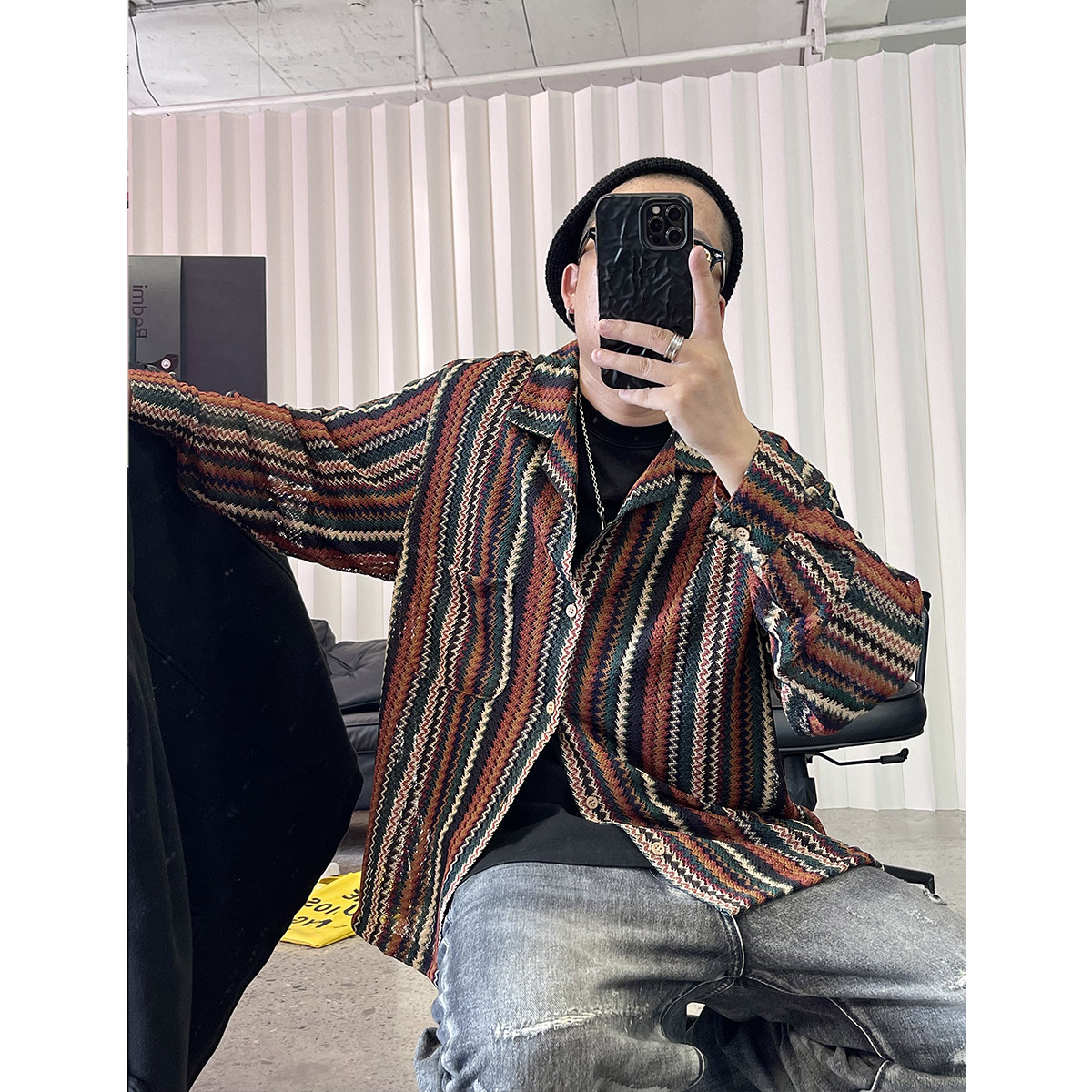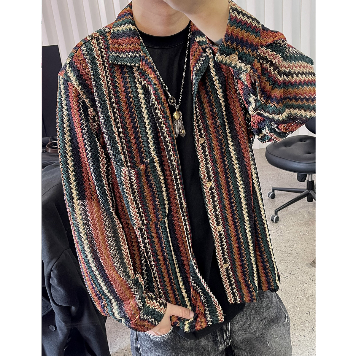Medaigual 复古色织撞色条纹镂空编织古巴衬衫男街头滑板长袖衬衣