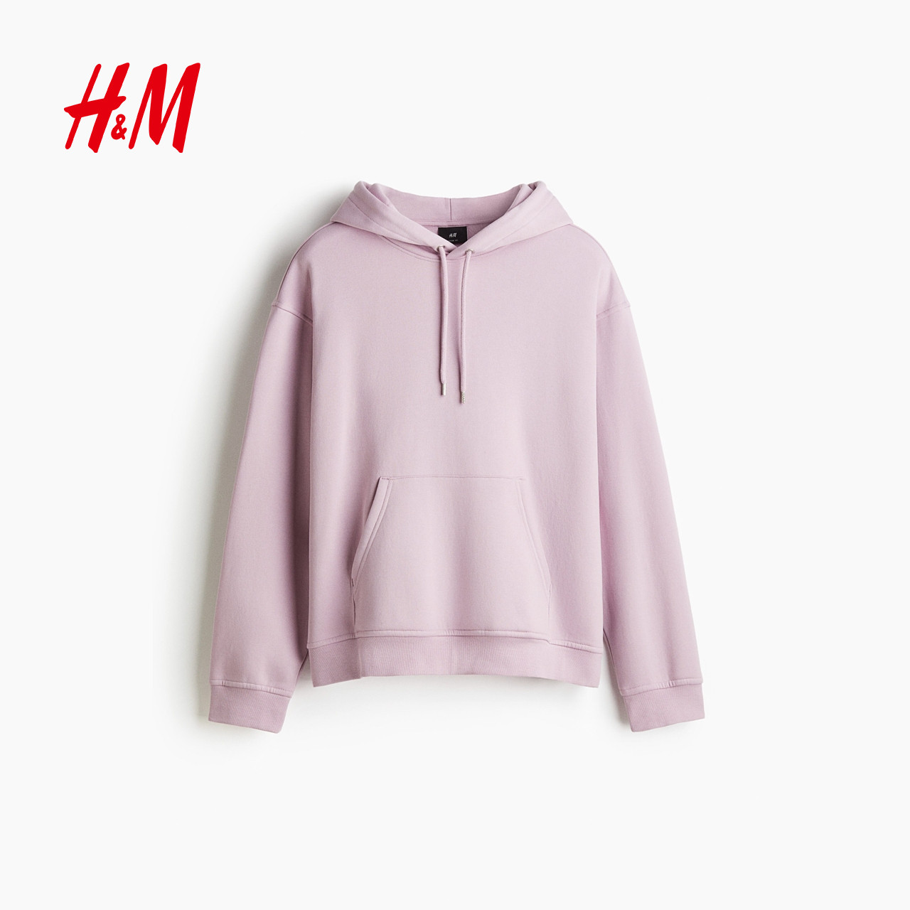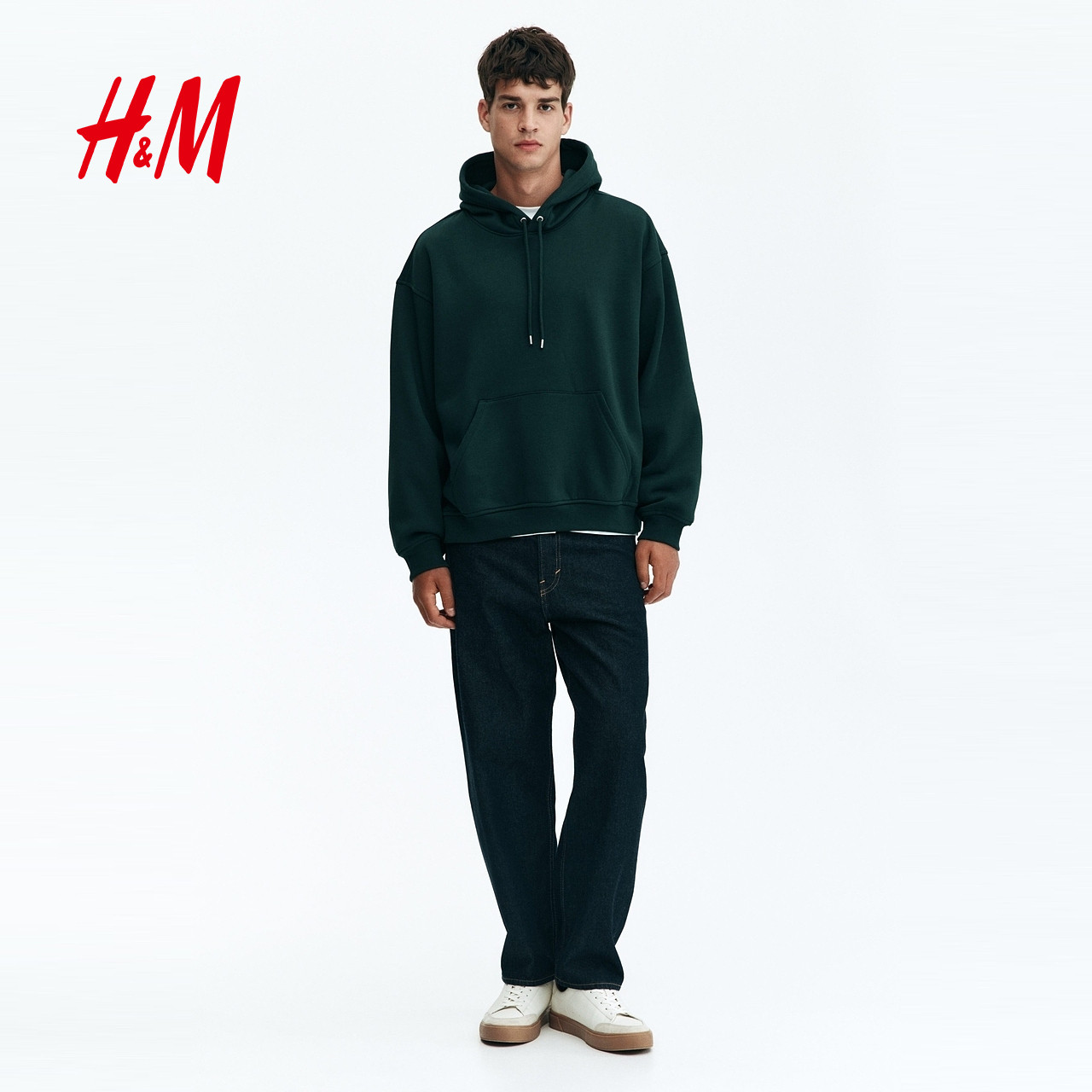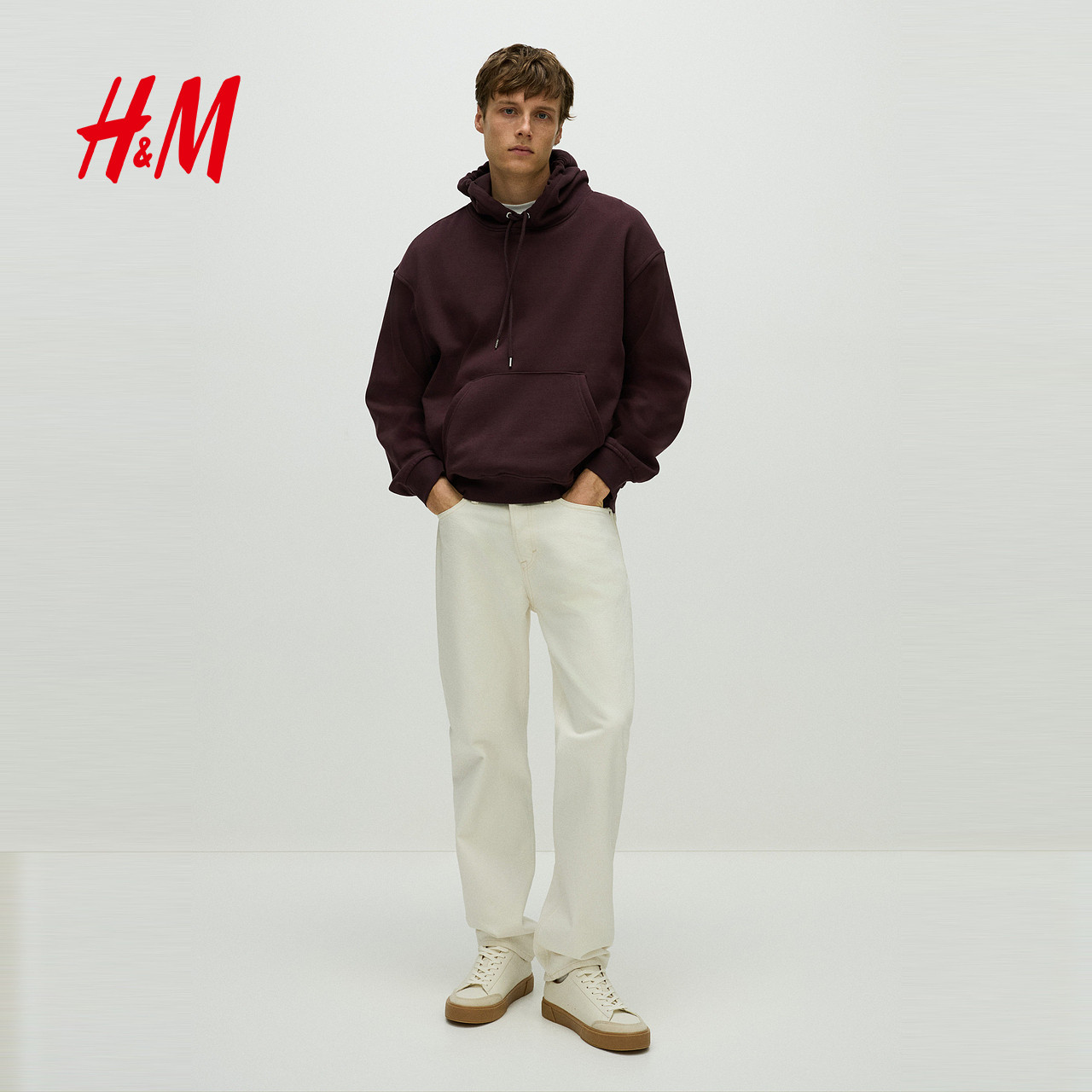 HM男装卫衣冬季装加绒情侣户外落肩宽松红色新年连帽衫0970819