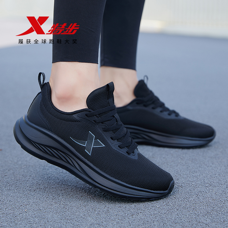 特步男鞋黑色运动鞋官方旗舰店正品夏季透气网面薄款纯黑色跑步鞋