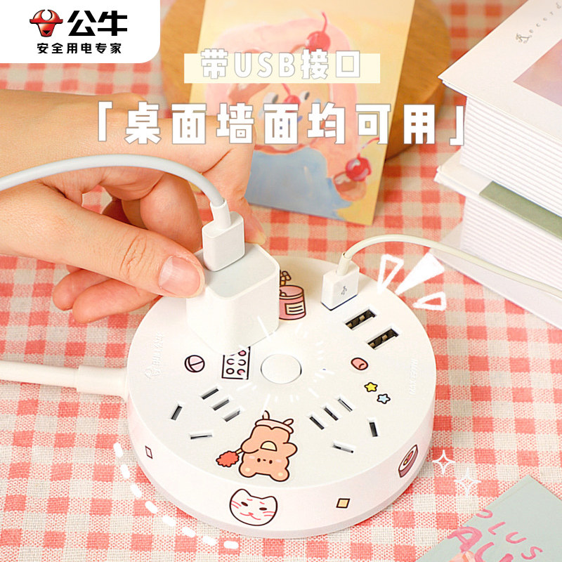 公牛圆形插座多功能学生可爱usb排插宿舍用卡通插板带线拖线板女