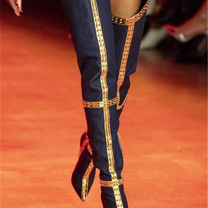 舞台走秀过膝加长靴牛拼色铆钉尖头高跟鞋细跟大码反串大腿靴47码
