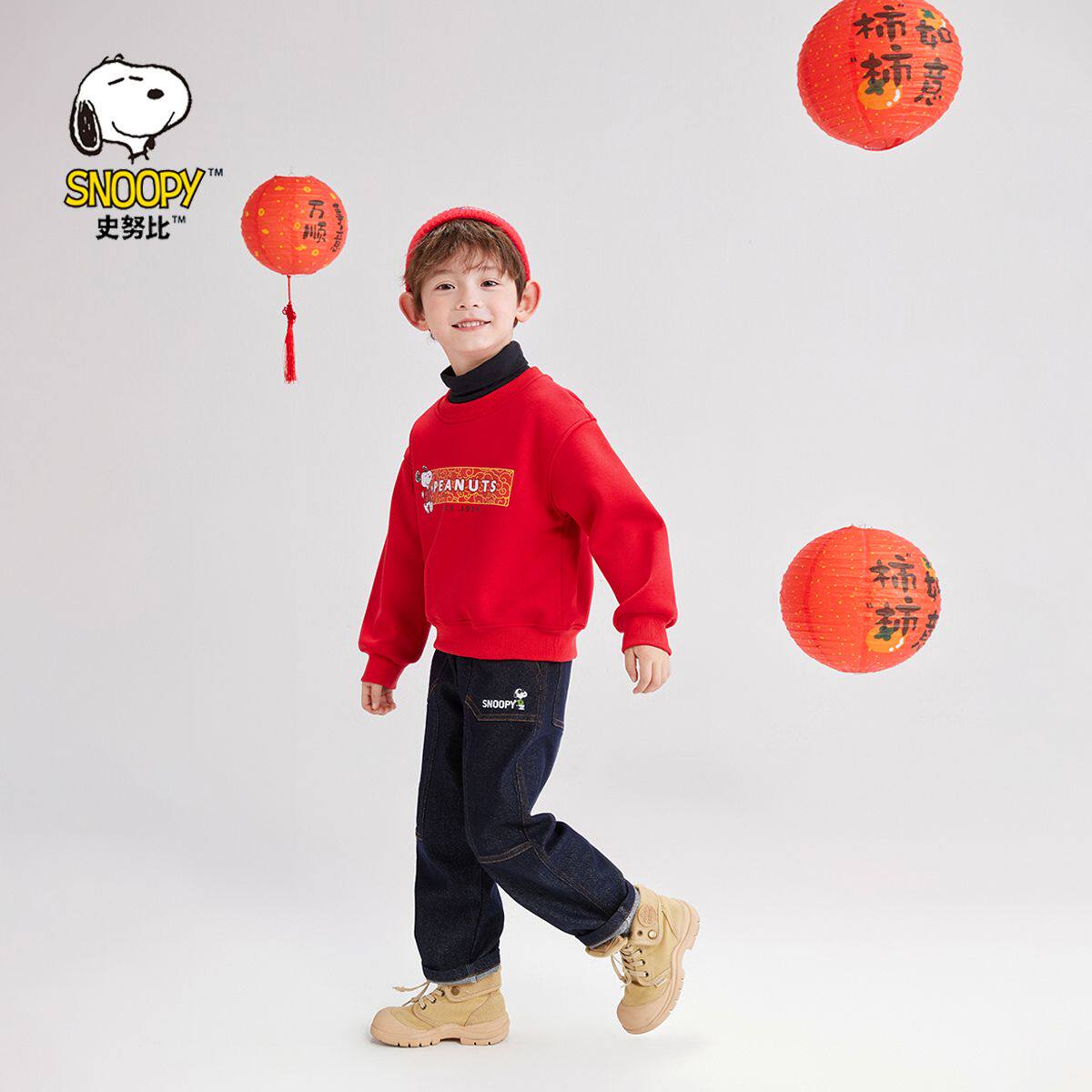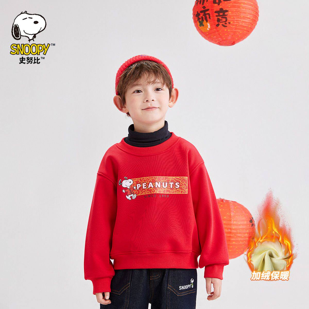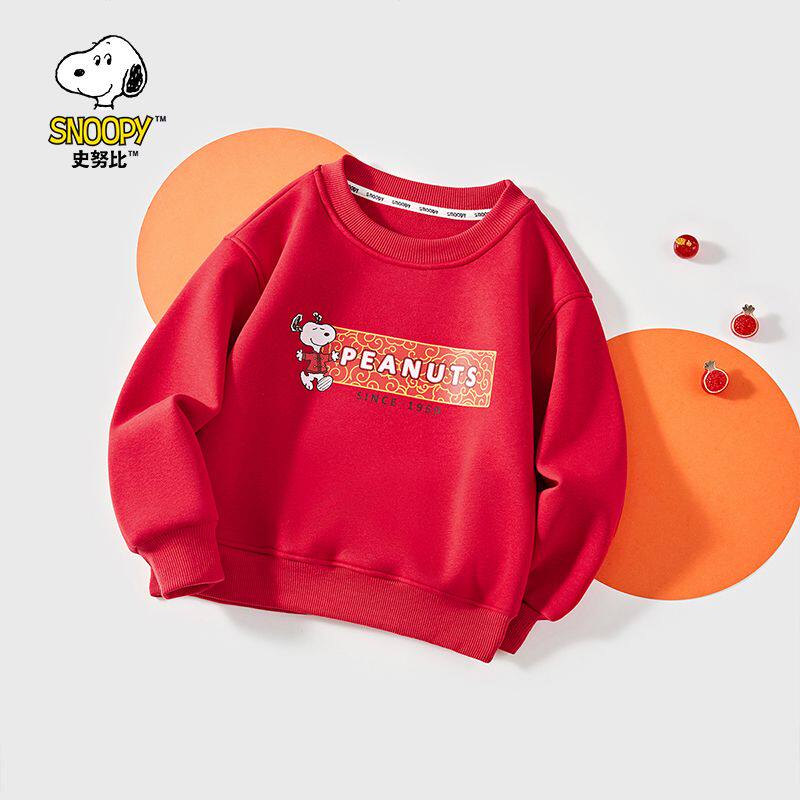 史努比新年红马年拜年服男女童儿童加绒圆领卫衣保暖加厚卫衣内搭