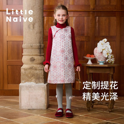 Little Naive儿童撞色纽扣背心裙秋冬夹棉保暖连衣裙女童中式裙子