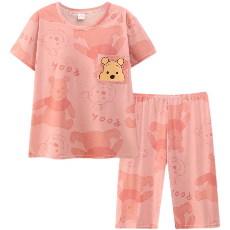 睡衣女夏季棉带胸垫一体式短袖五分裤学生可爱宽松外穿家居服套装