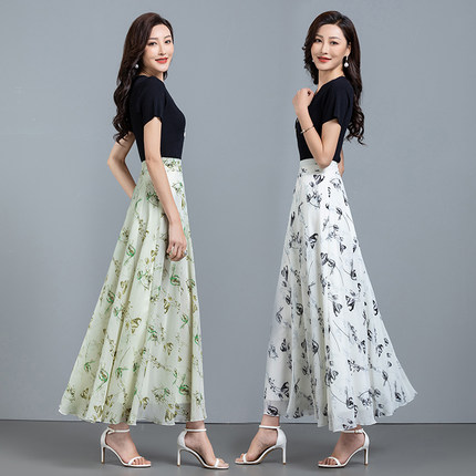 2025夏季新款复古白色碎花雪纺半身裙高腰大码a字气质长裙大摆裙