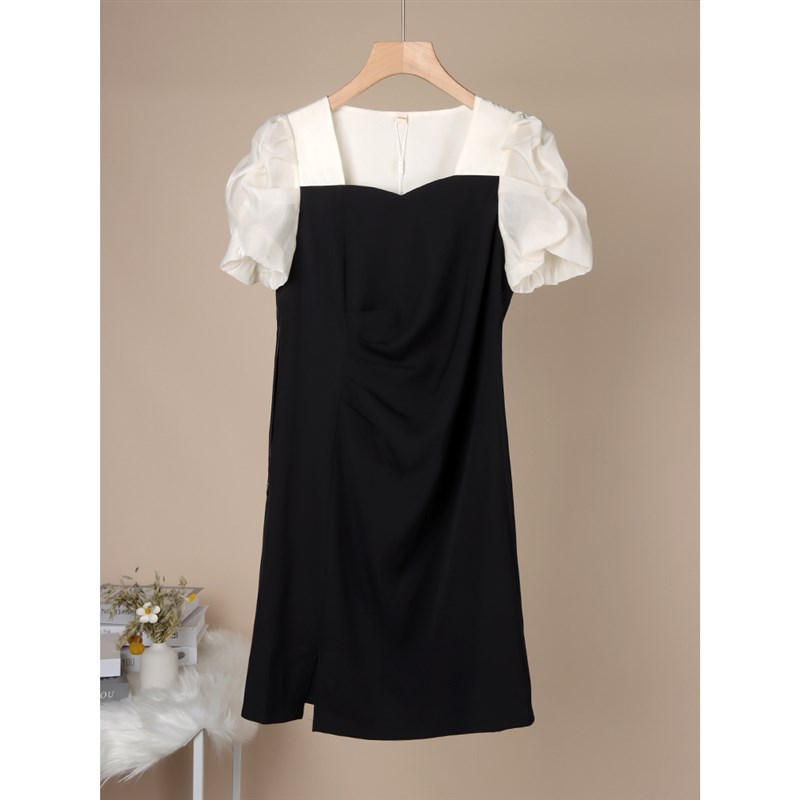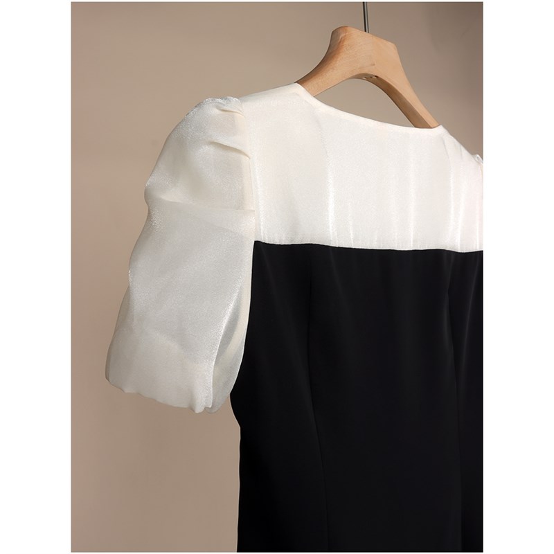 299夏季新款假两件黑白拼接收腰气质修身显瘦开叉连衣裙