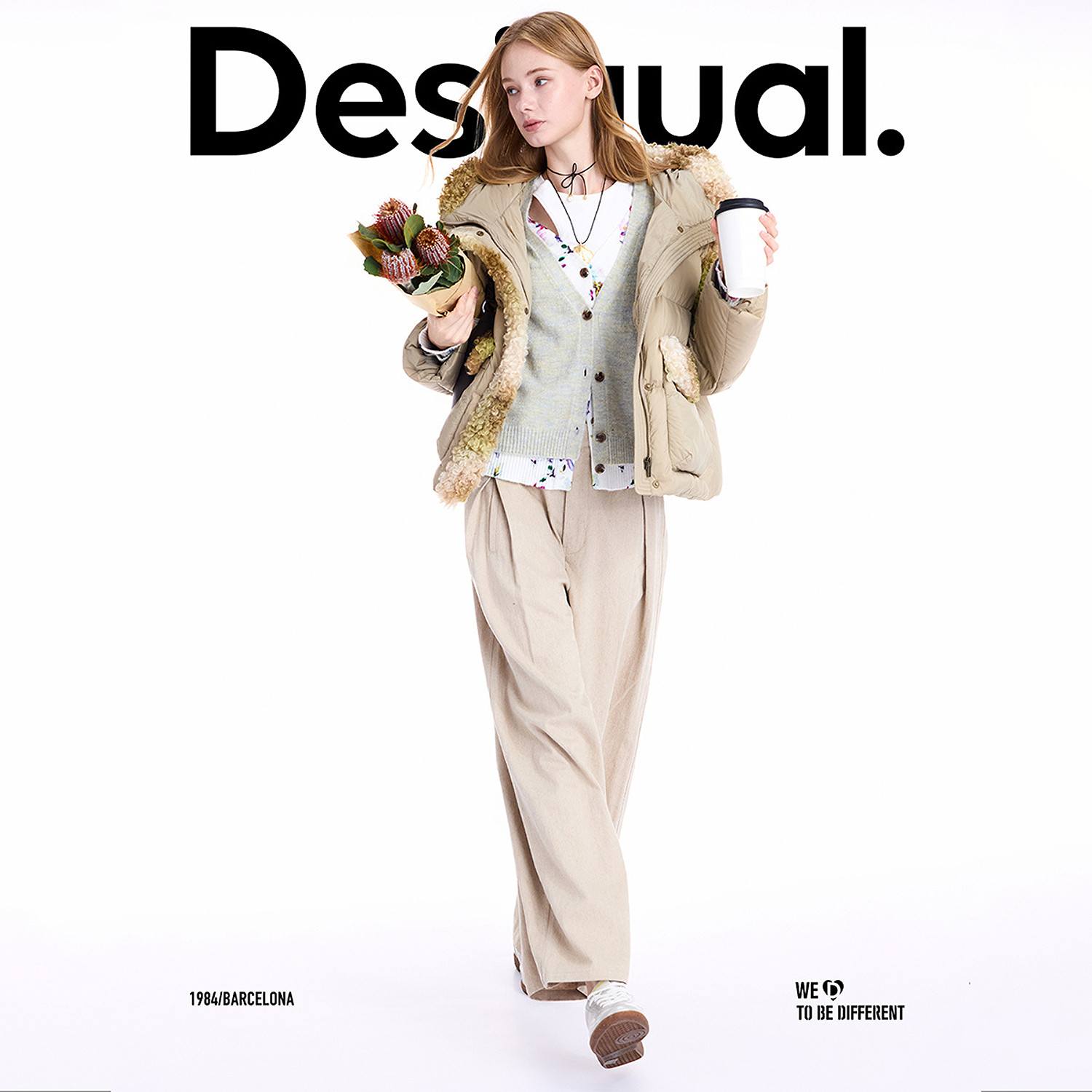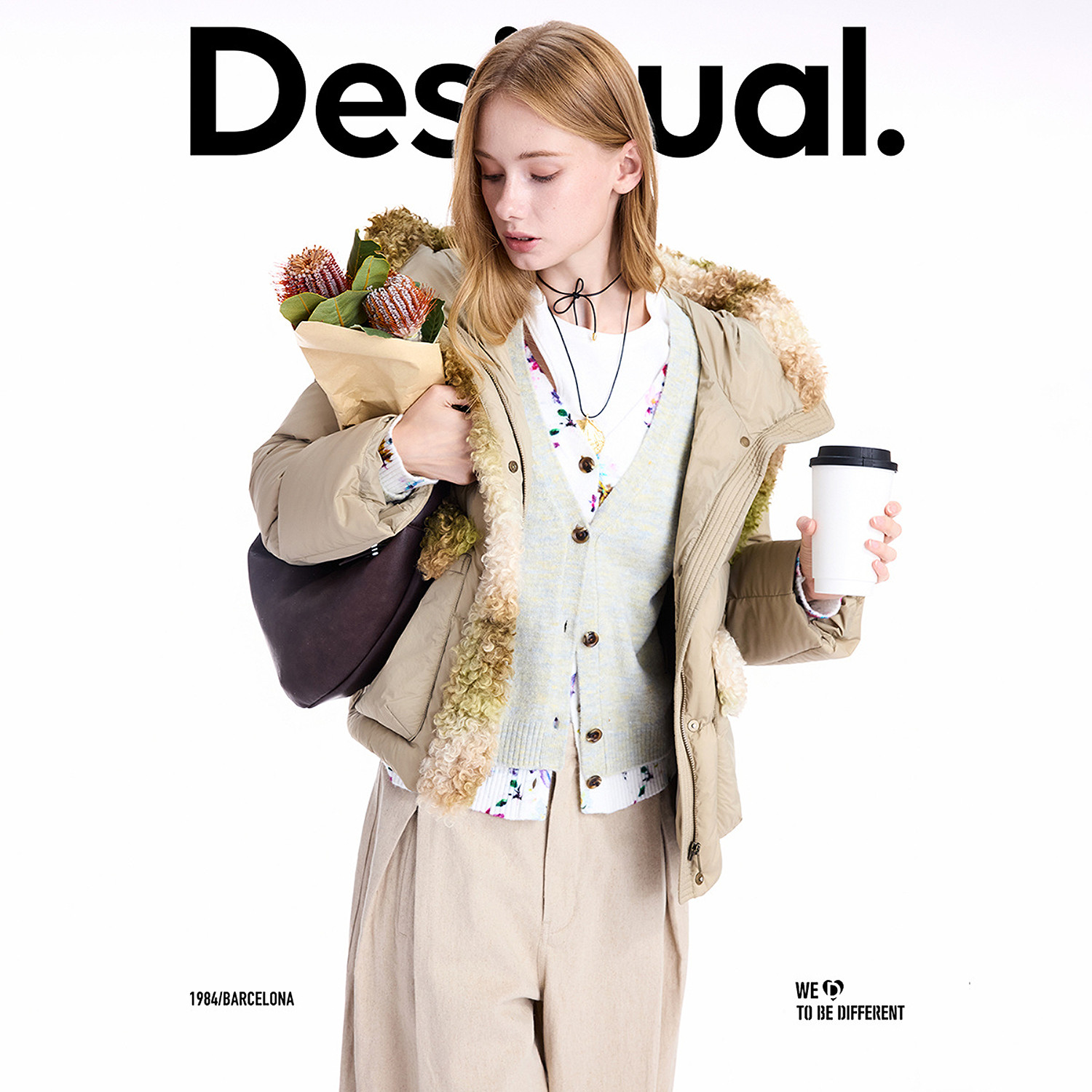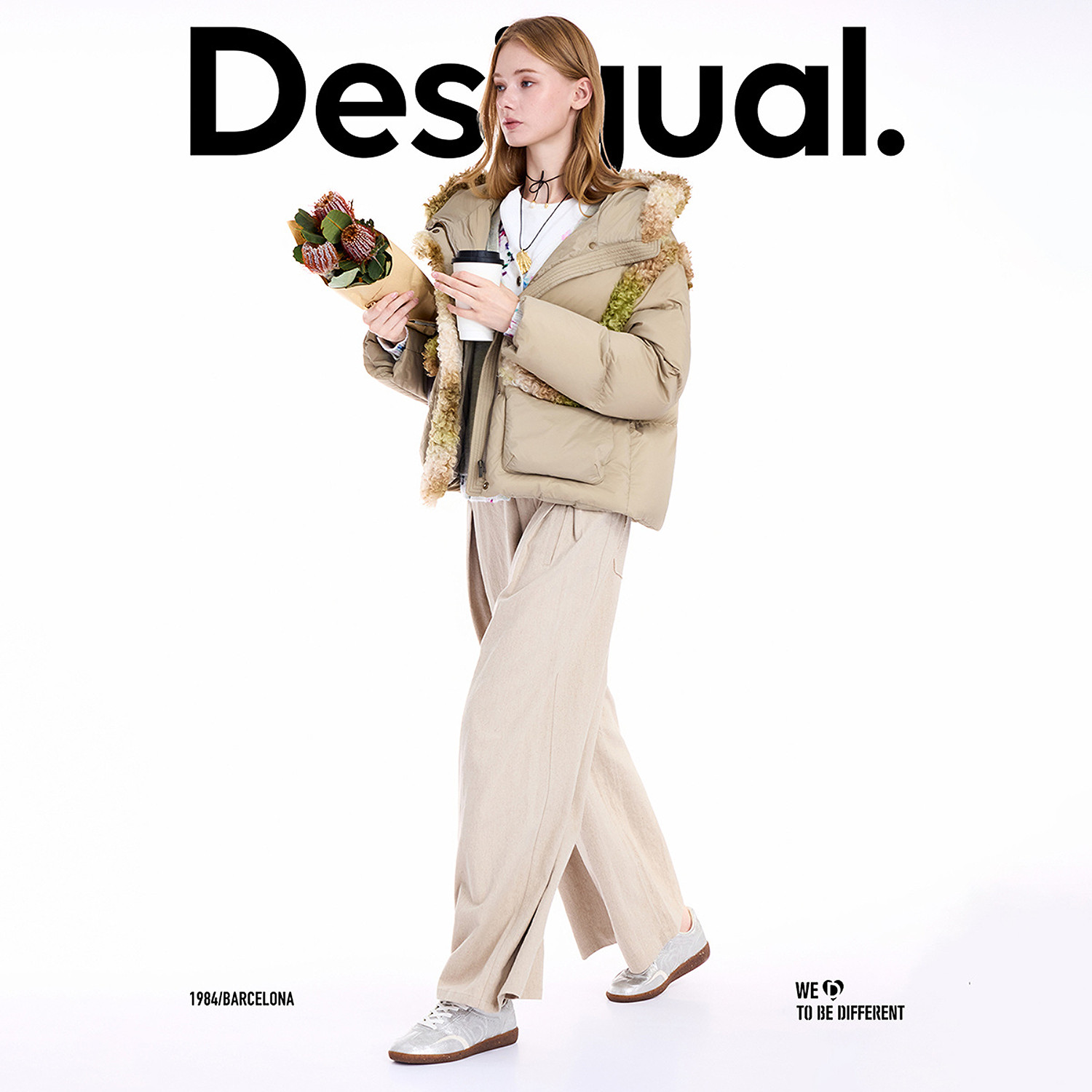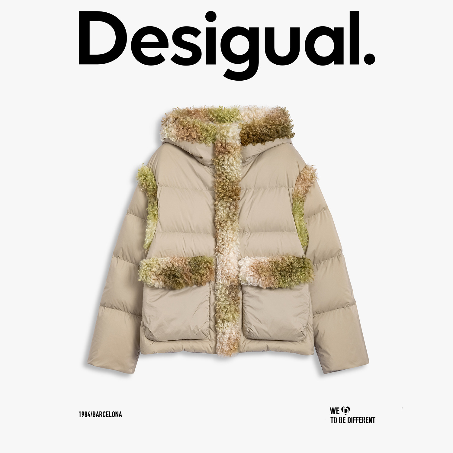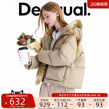 【保暖90白鸭绒】Desigual仿羊羔毛拼接连帽女士羽绒服