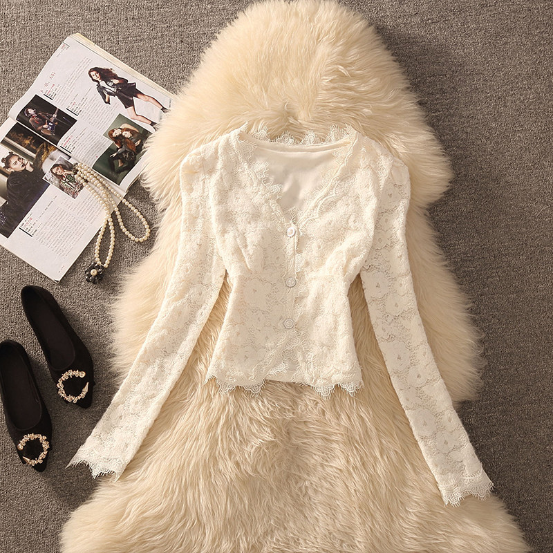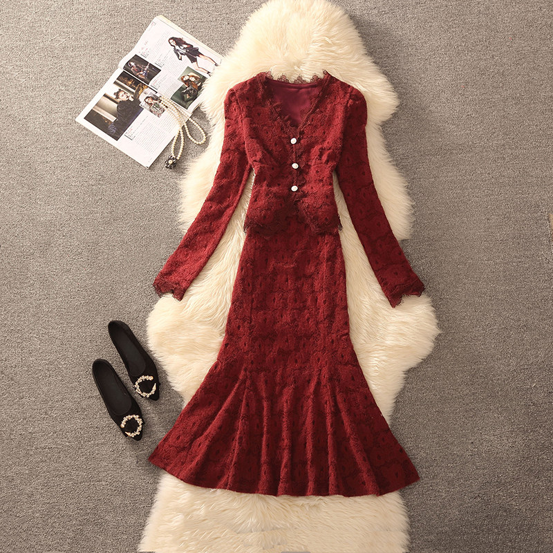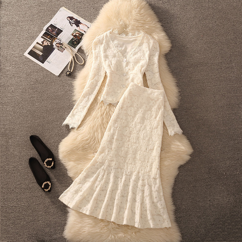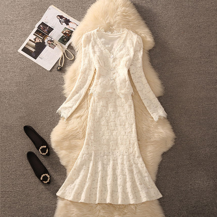 2026春秋装法式高级感蕾丝连衣裙气质名媛风长袖收腰鱼尾裙套装