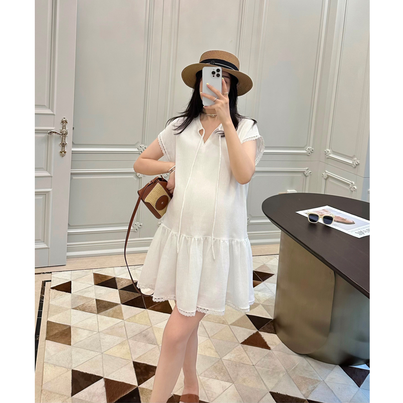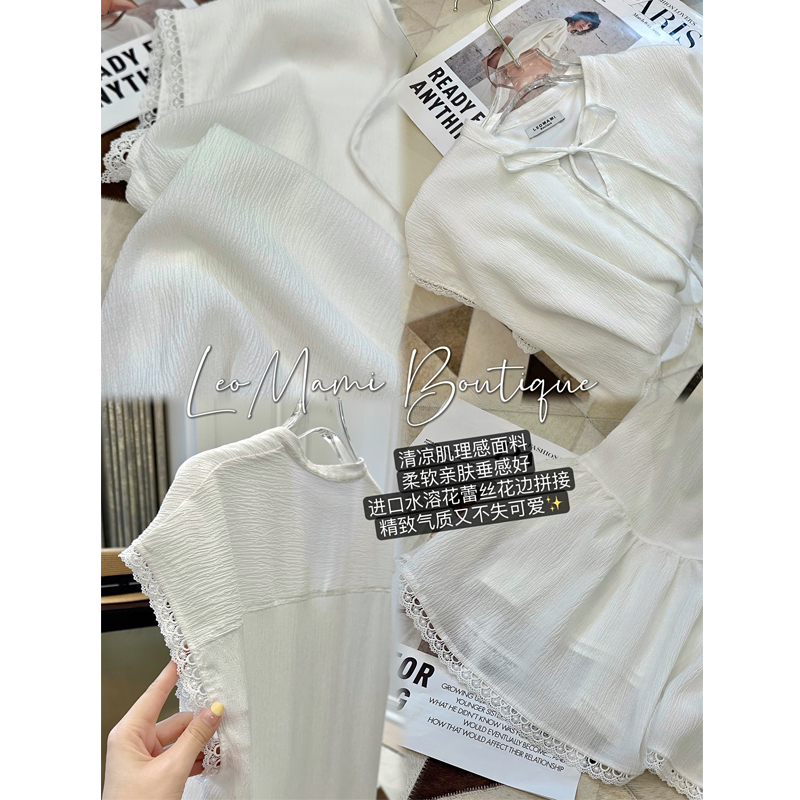 LeoMami孕妇装夏款少女肌理感连衣裙蕾丝拼接小飞袖法式V领裙子
