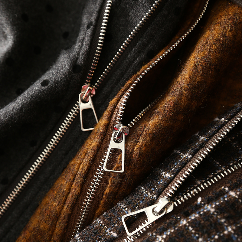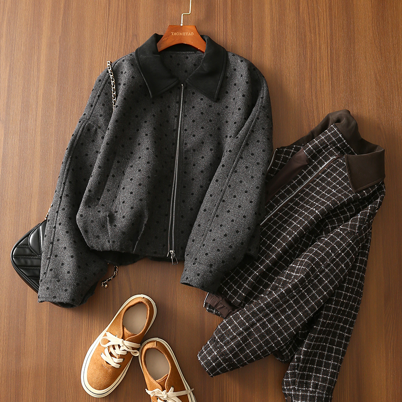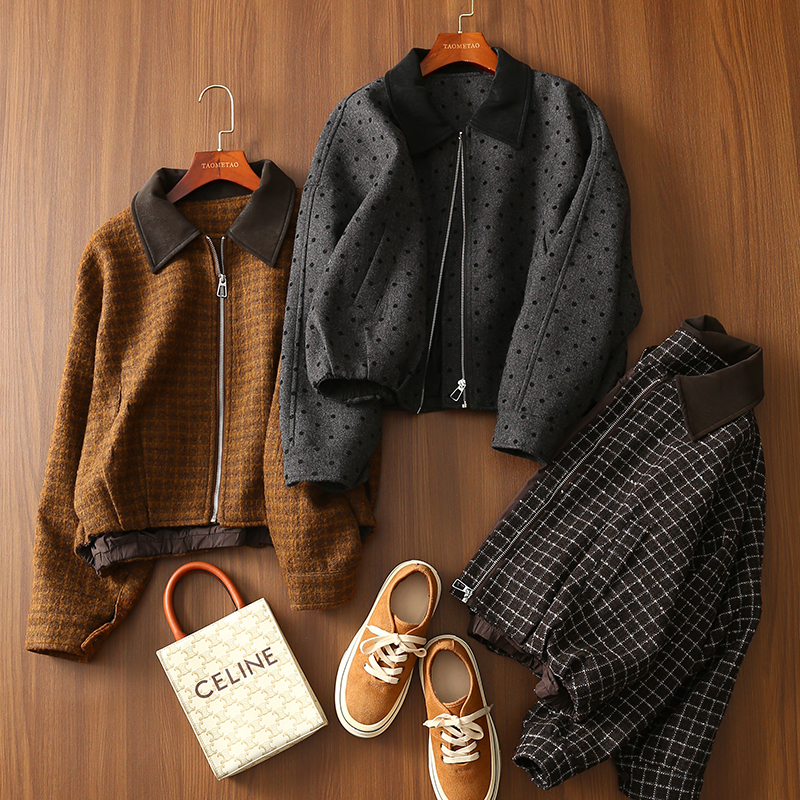 淘么淘 秋日美拉德风~羊毛格纹拼接麂皮绒翻领短款夹克毛呢外套女