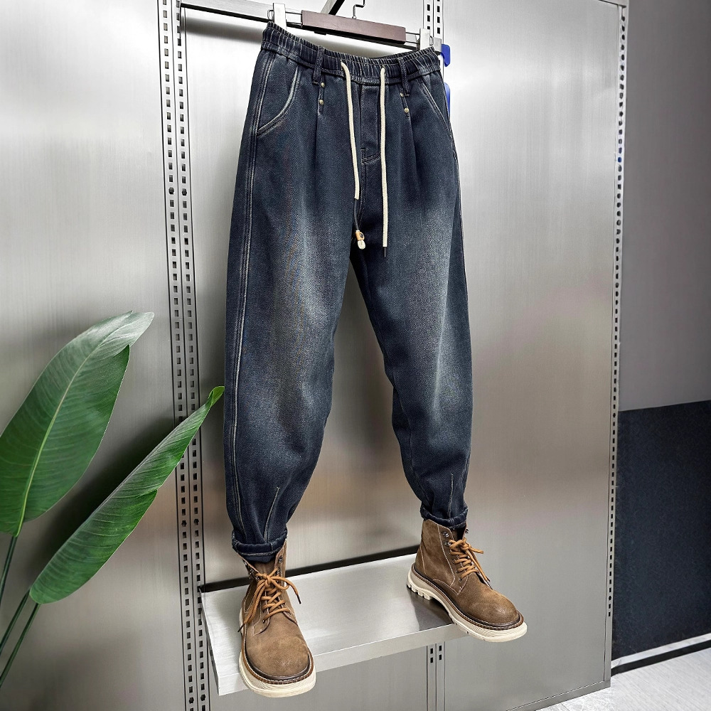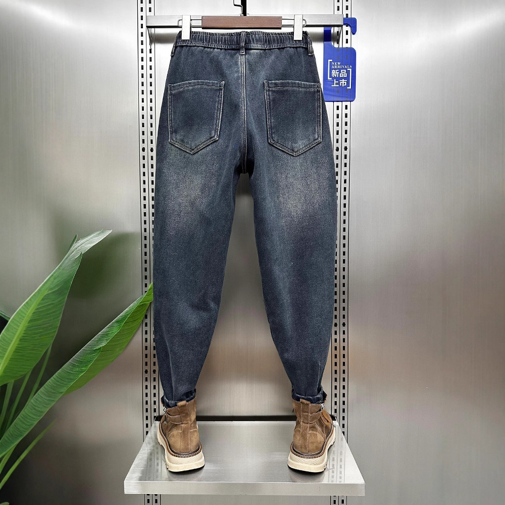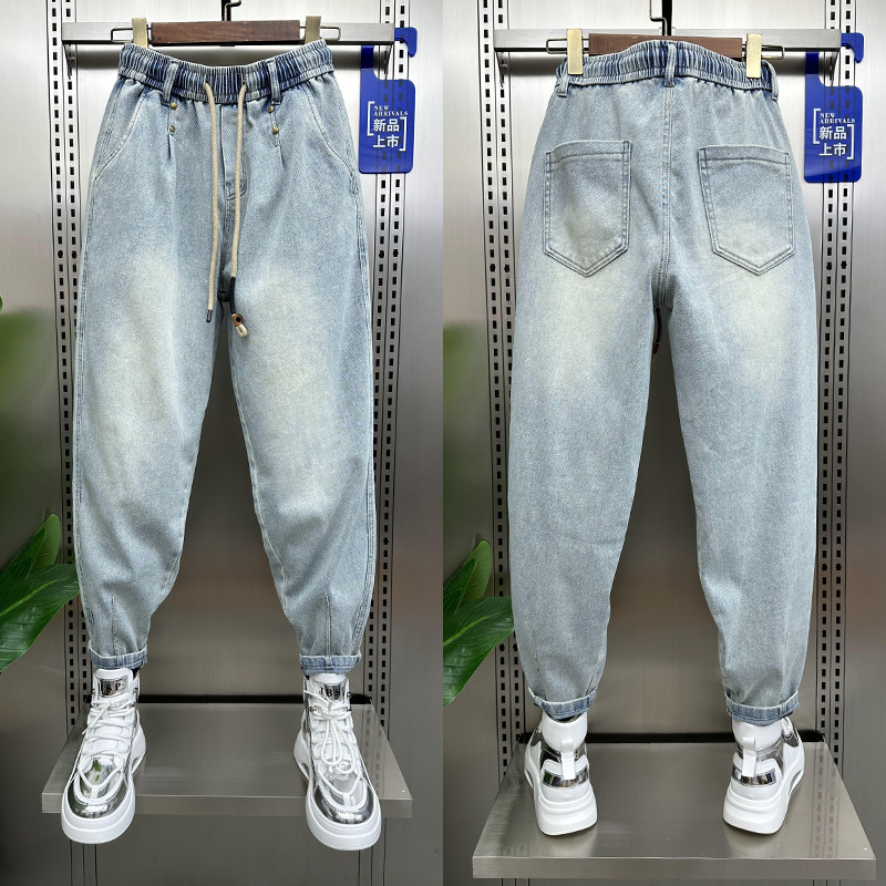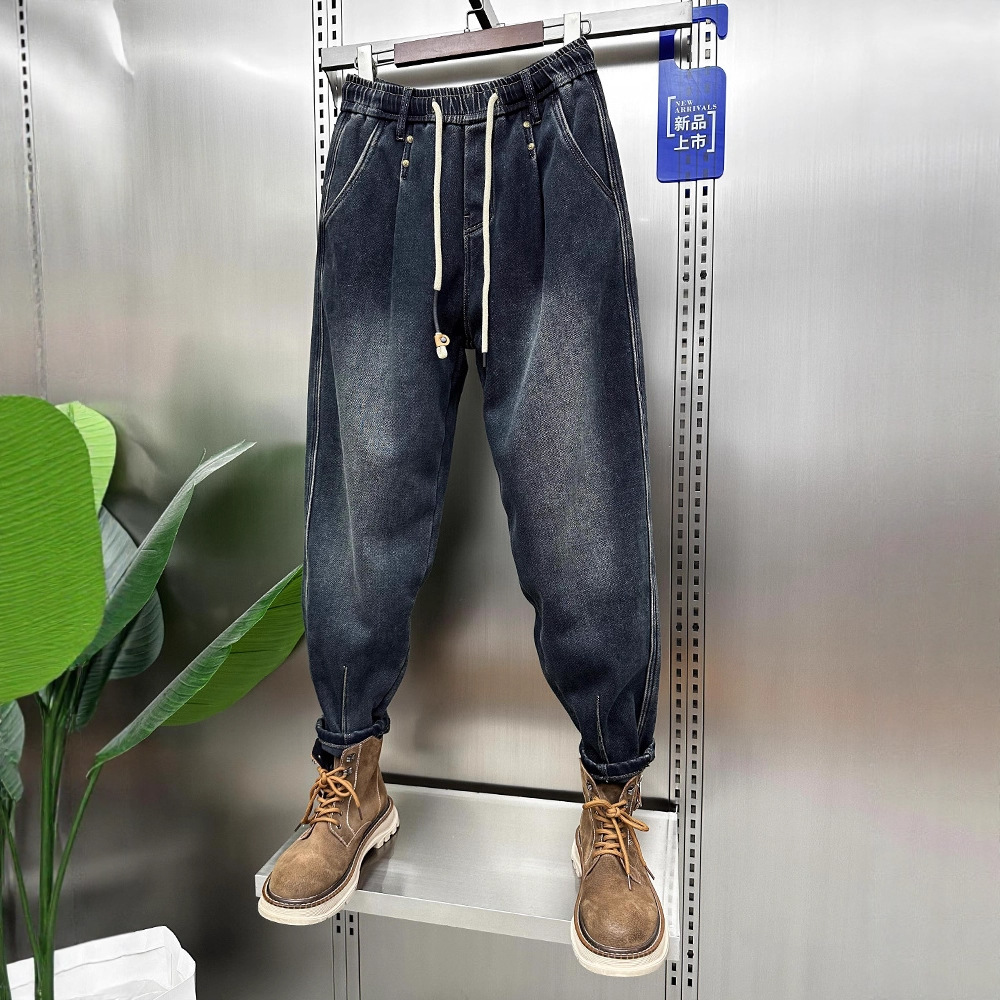 松紧腰牛仔裤男宽松水洗复古美式高街裤子潮流百搭小脚哈伦老爹裤