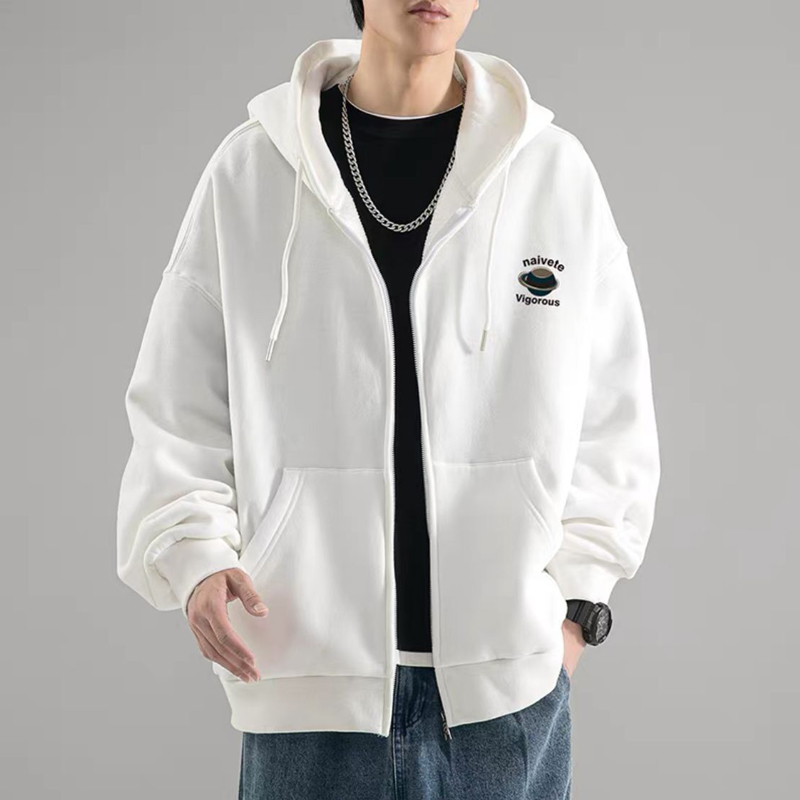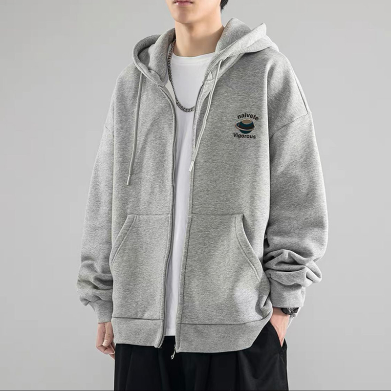 重磅纯棉开衫连帽卫衣男加绒加厚秋冬装简约字母宽松学生拉链外套