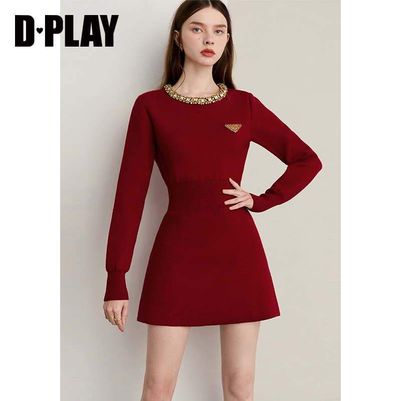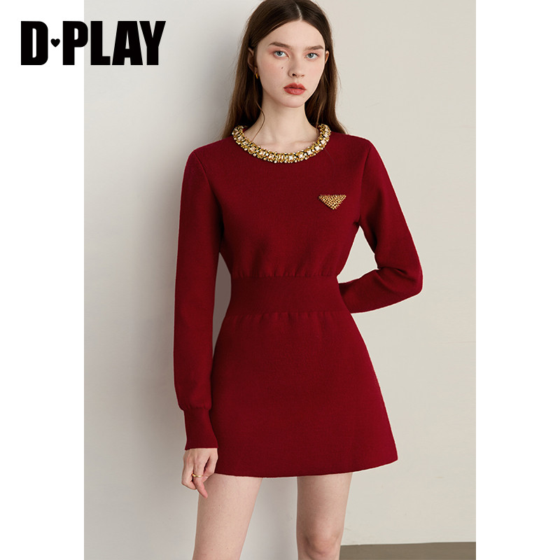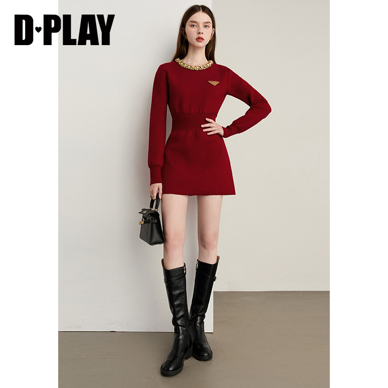 DPLAY2025冬季新款红色针织连衣裙高级长袖修身气质收腰裙子女