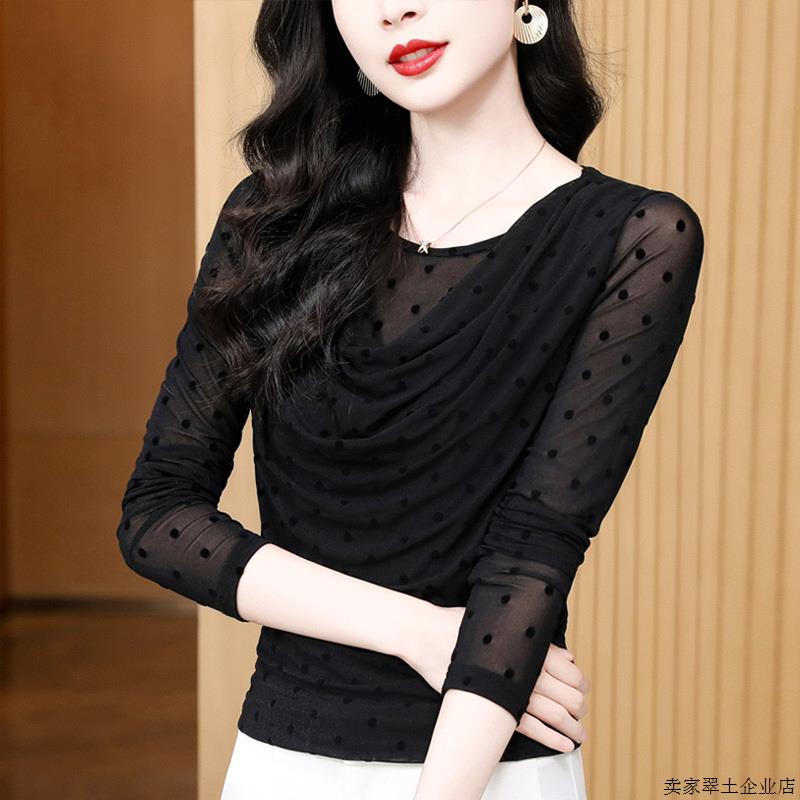 堆堆领网纱打底衫女内搭2025年新款圆点植绒小衫长袖T恤蕾丝上衣