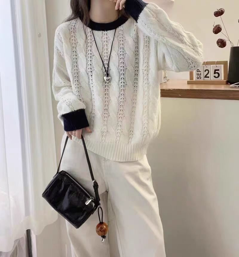 2025秋冬圆领拼色羊绒衫上衣女麻花纹纯羊毛针织衫套头软糯毛衣厚