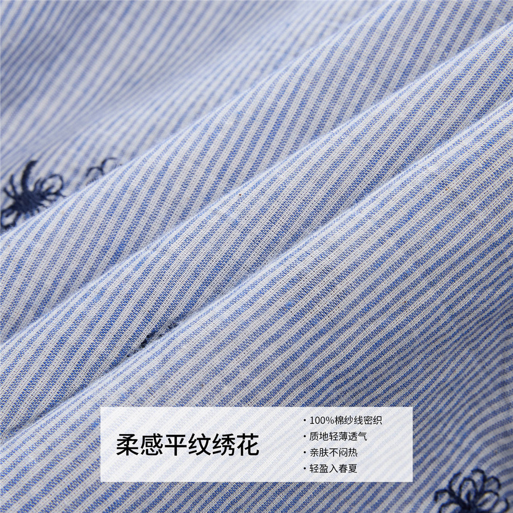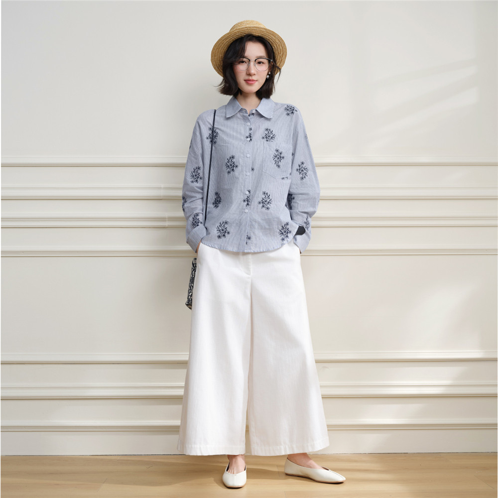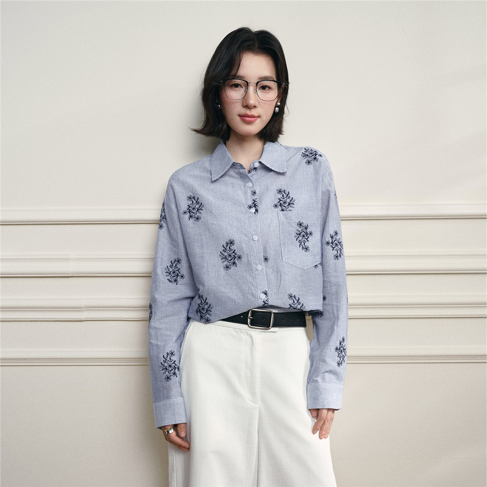 设计师款佐丹奴2026年春花朵刺绣口袋宽松长袖条纹衬衫女18346302