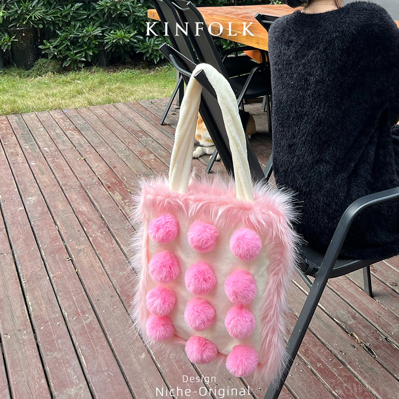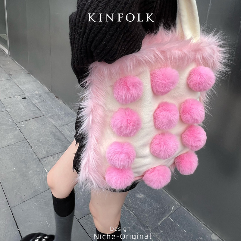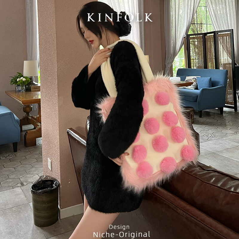 可爱毛球毛毛包大容量单肩包撞色