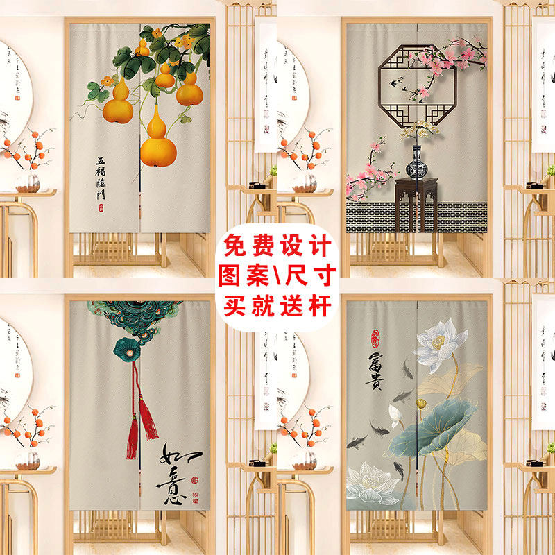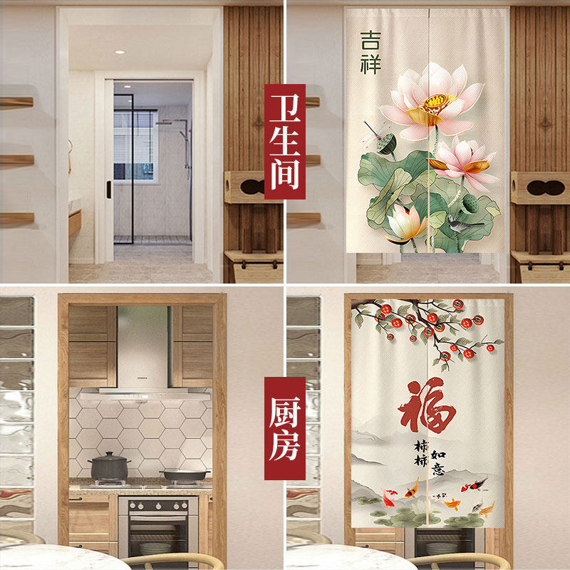 中式荷花门帘布艺隔断帘卧室卫生间挂帘家用厨房遮挡帘免打孔帘子