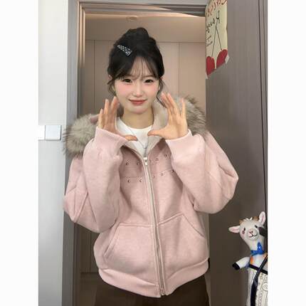 欢简韵美式钉珠毛领连帽加绒外套女秋冬2026新款百搭开衫小众上衣