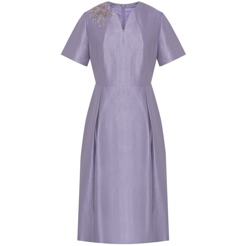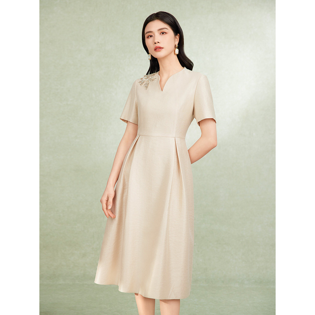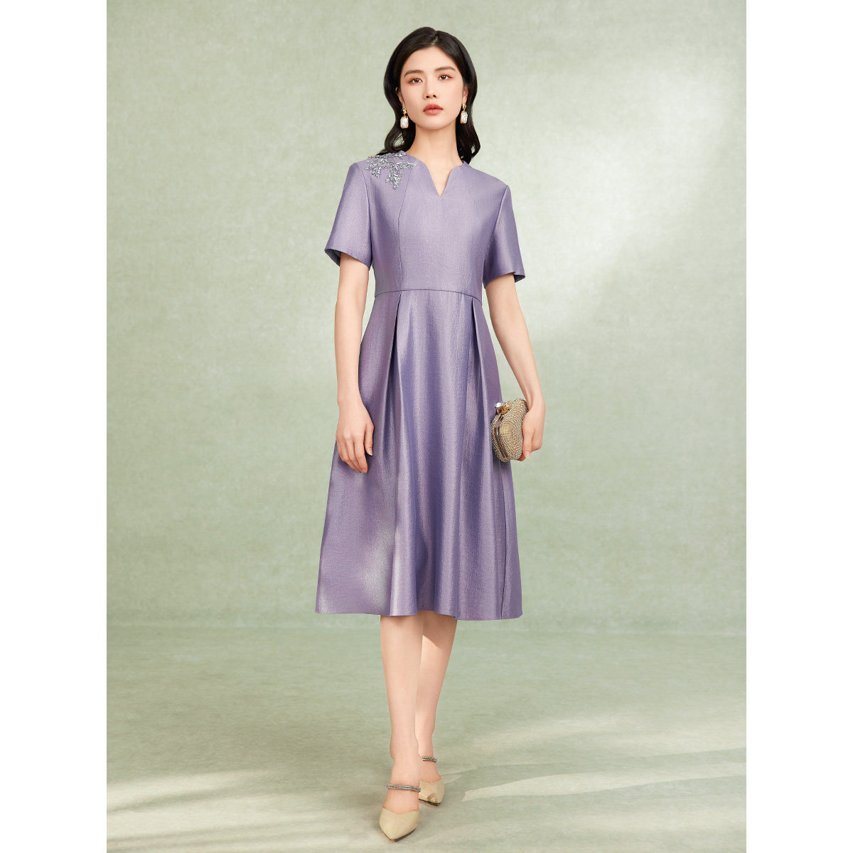 【重工钉珠礼服裙】粉蓝衣橱2026夏新款光感仿丝毛精致短袖连衣裙