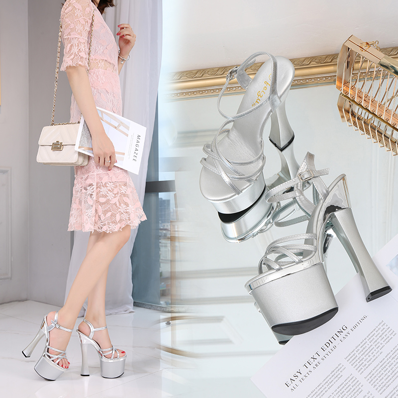 恨天高银色婚鞋粗跟防水台模特夜店演出鞋18cm/20公分超高跟凉鞋