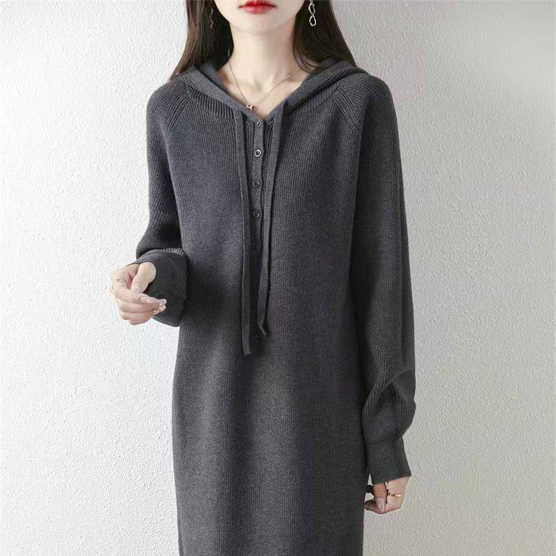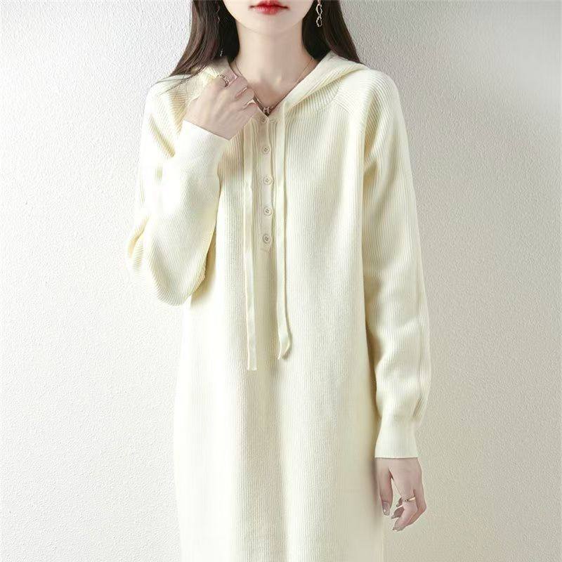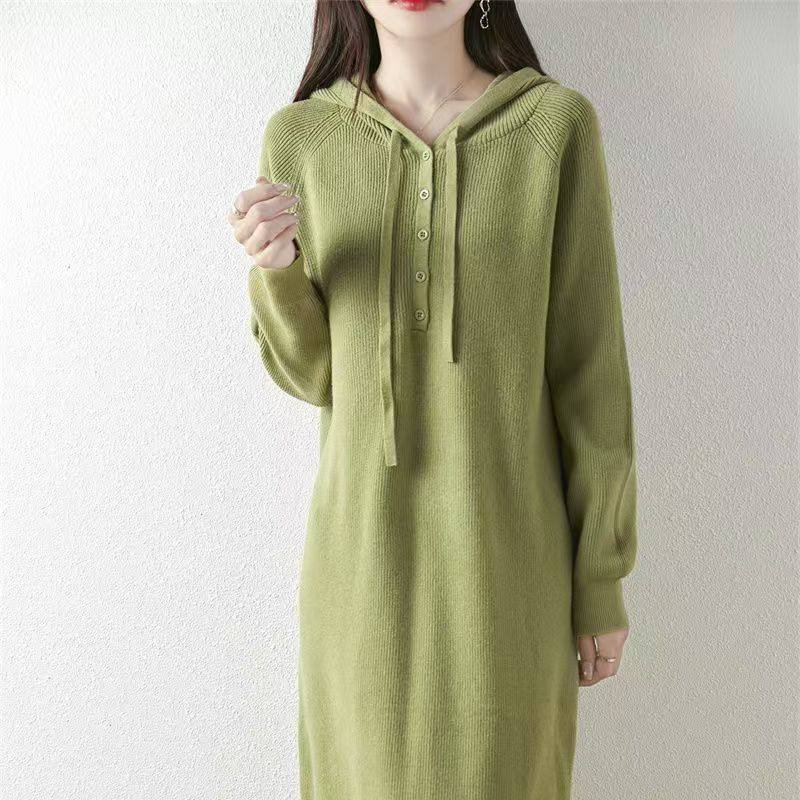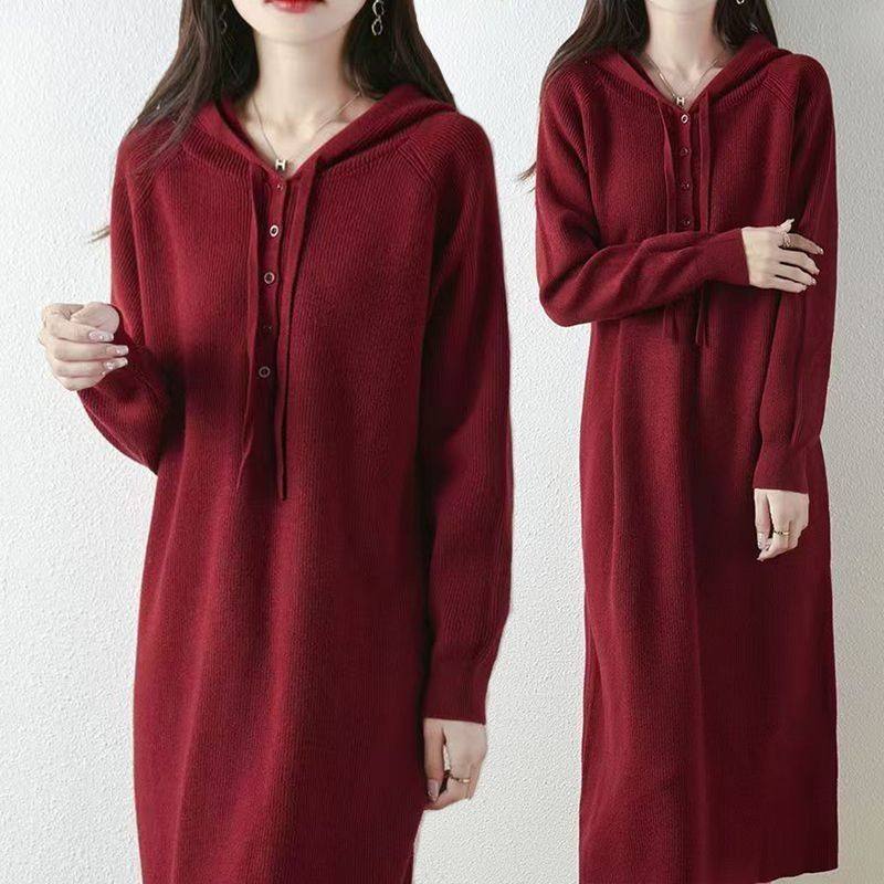 过膝中长款针织连衣裙女新款秋冬宽松大码连帽打底衫休闲毛衣裙纯
