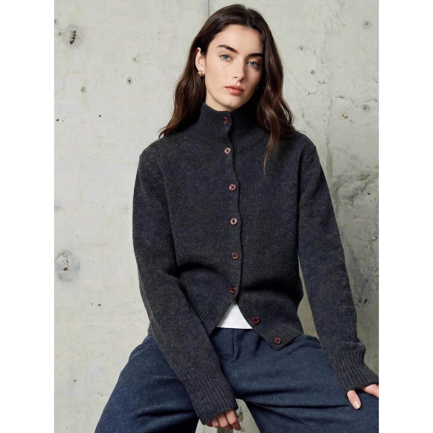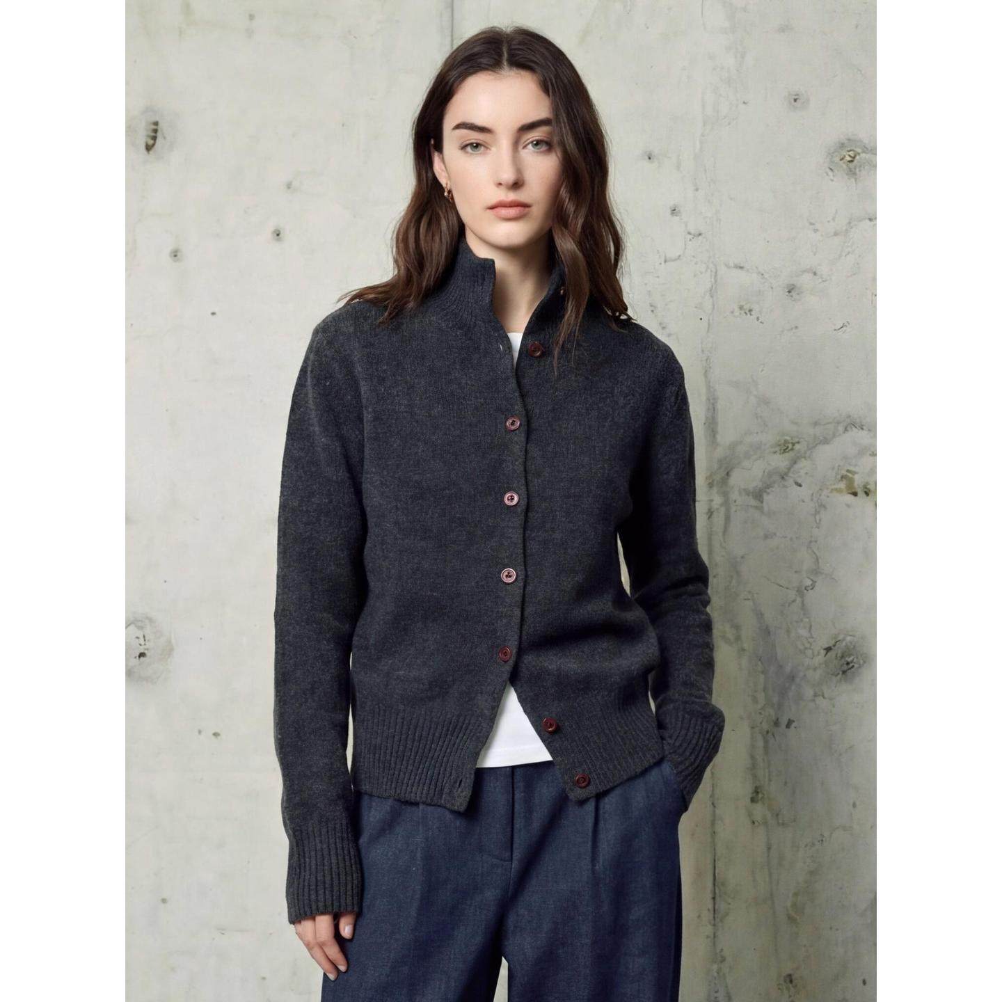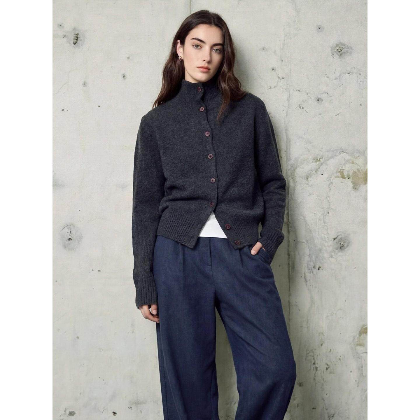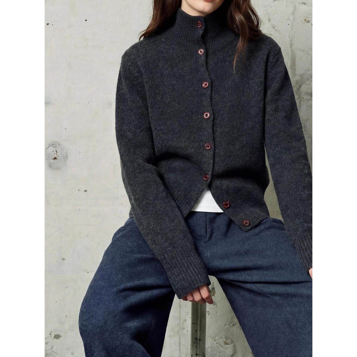 Basic House/百家好灰色高领针织开衫女冬设计感软糯羊毛毛衣外套