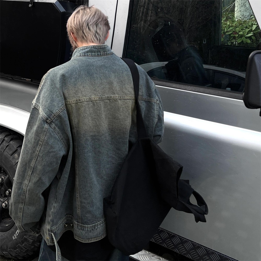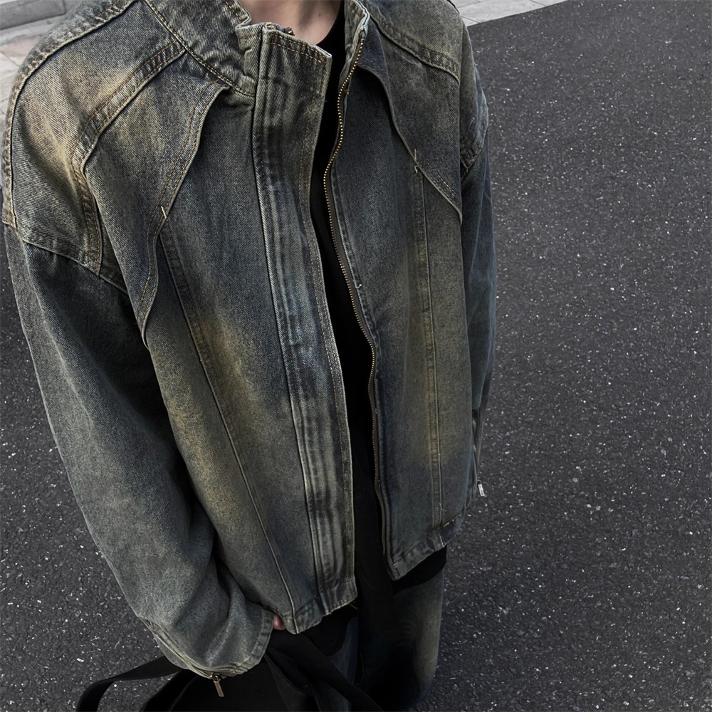 美式复古水洗黄泥染蓝色立领牛仔夹克男款痞帅宽松拉链外套上衣潮