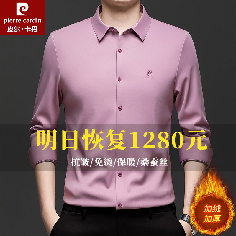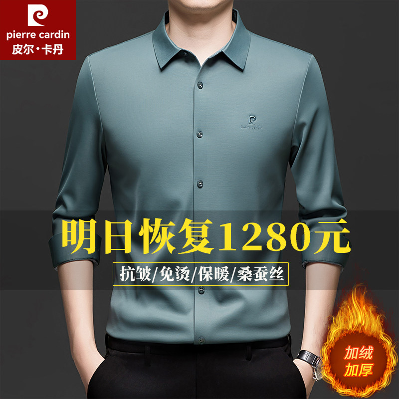 皮尔卡丹桑蚕丝长袖衬衫男2025秋冬新款加绒加厚中年休闲免烫衬衣