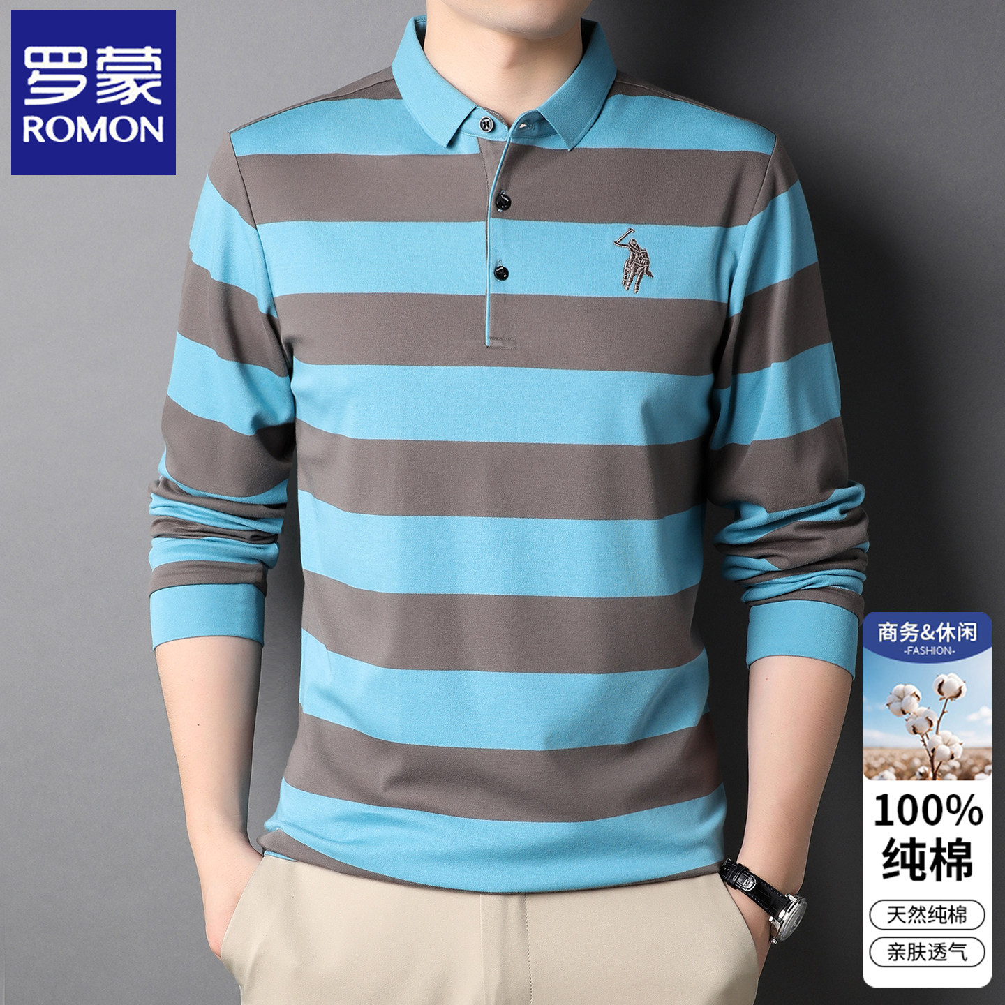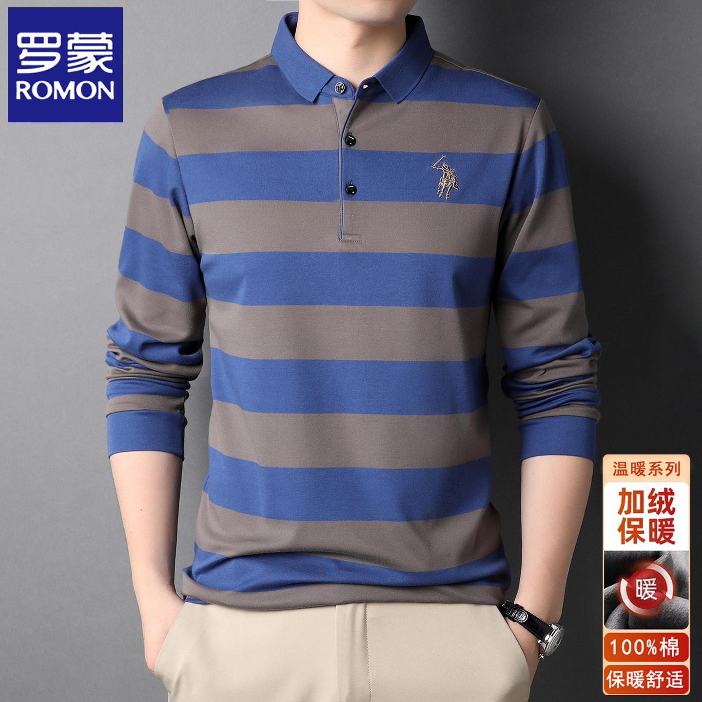 罗蒙春秋季纯棉长袖T恤男士条纹中年翻领休闲全棉加绒打底POLO衫