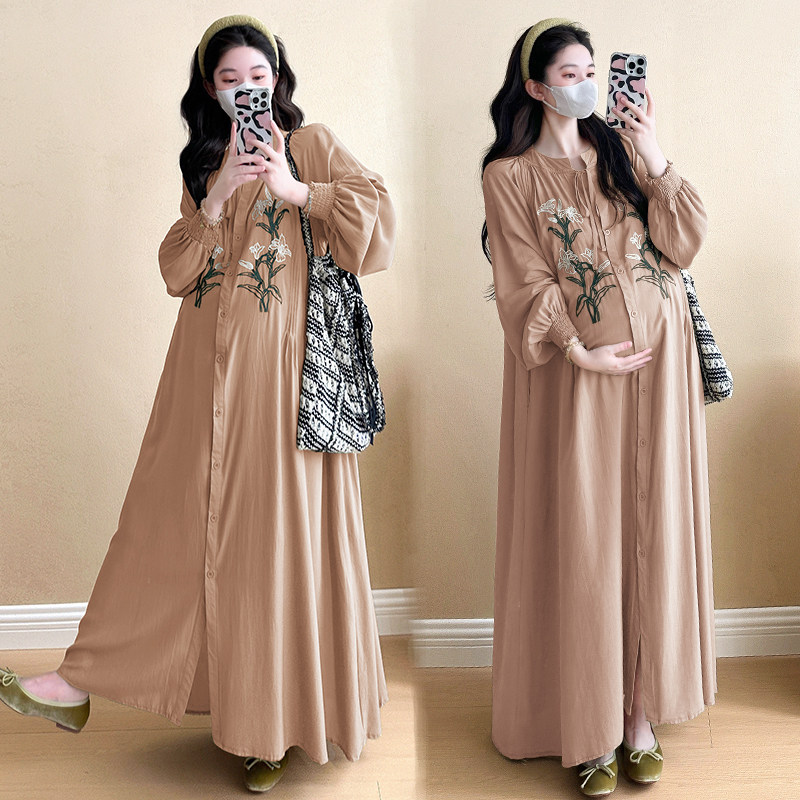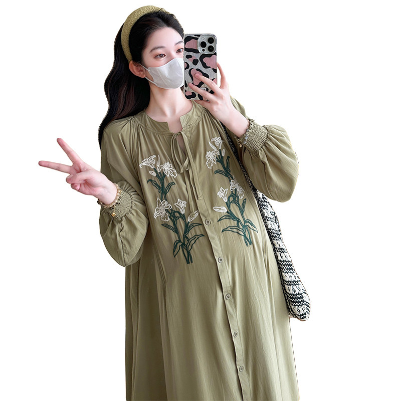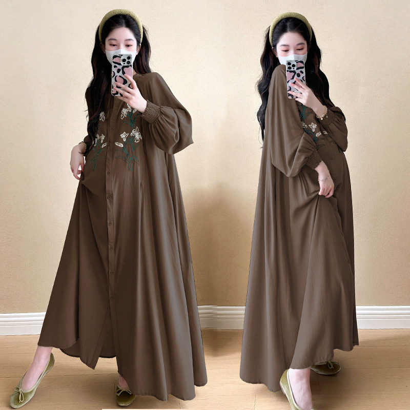 大码孕妇装衬衫裙春秋款过膝长款气质V领新中式连衣裙女显瘦200斤