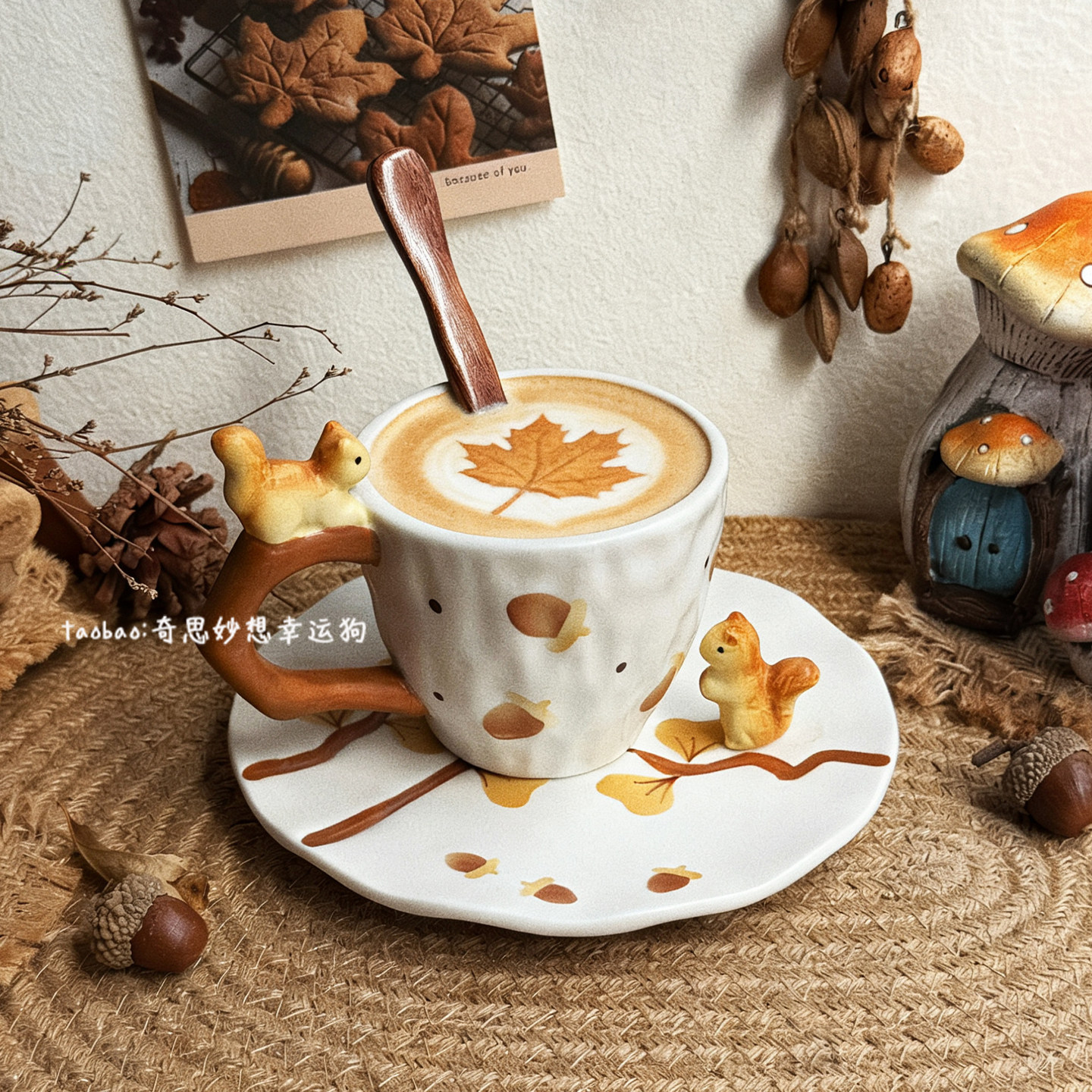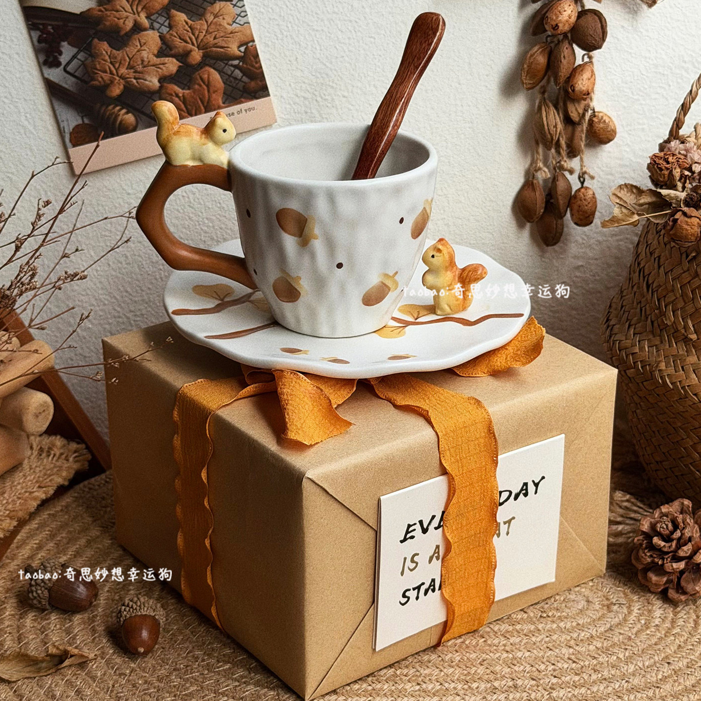 新婚伴手礼可爱小松鼠咖啡杯碟套装送闺蜜生日礼物陶瓷马克杯带勺