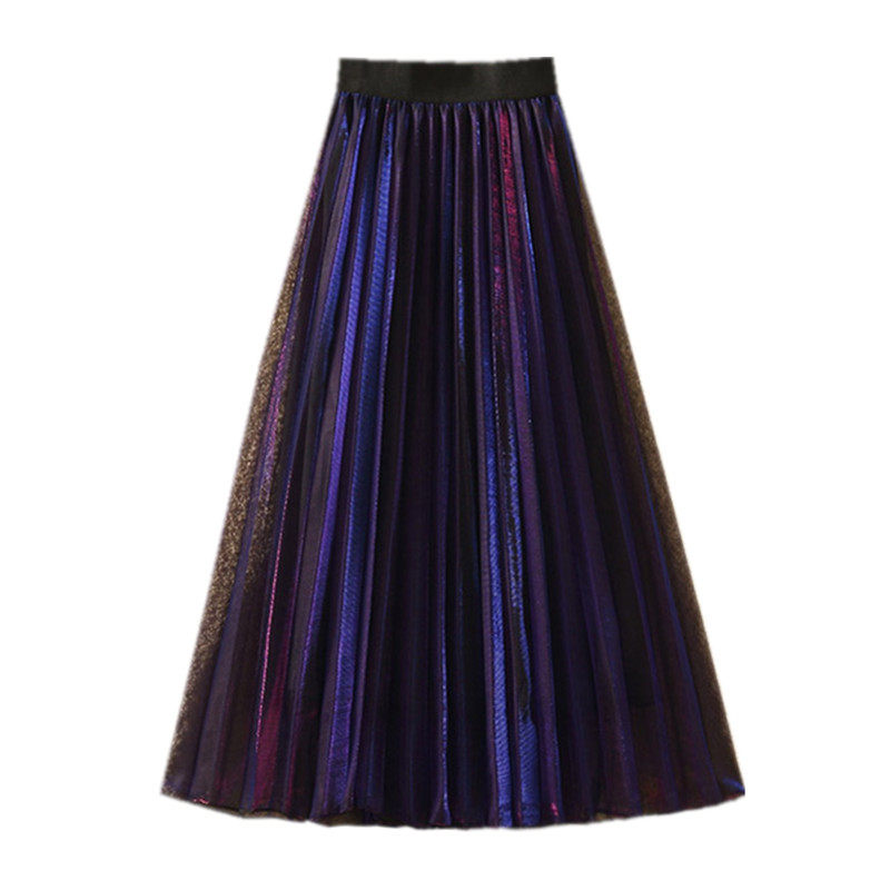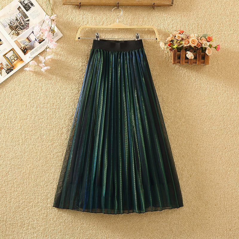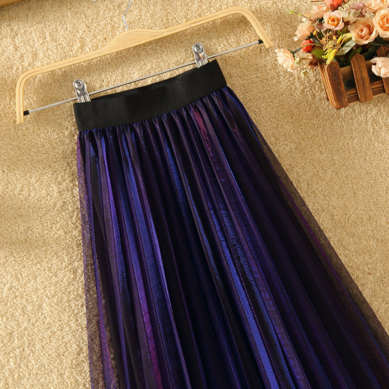 渐变色网纱半身裙女春夏高腰显瘦反光a字百褶中长款裙子仙女纱裙